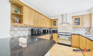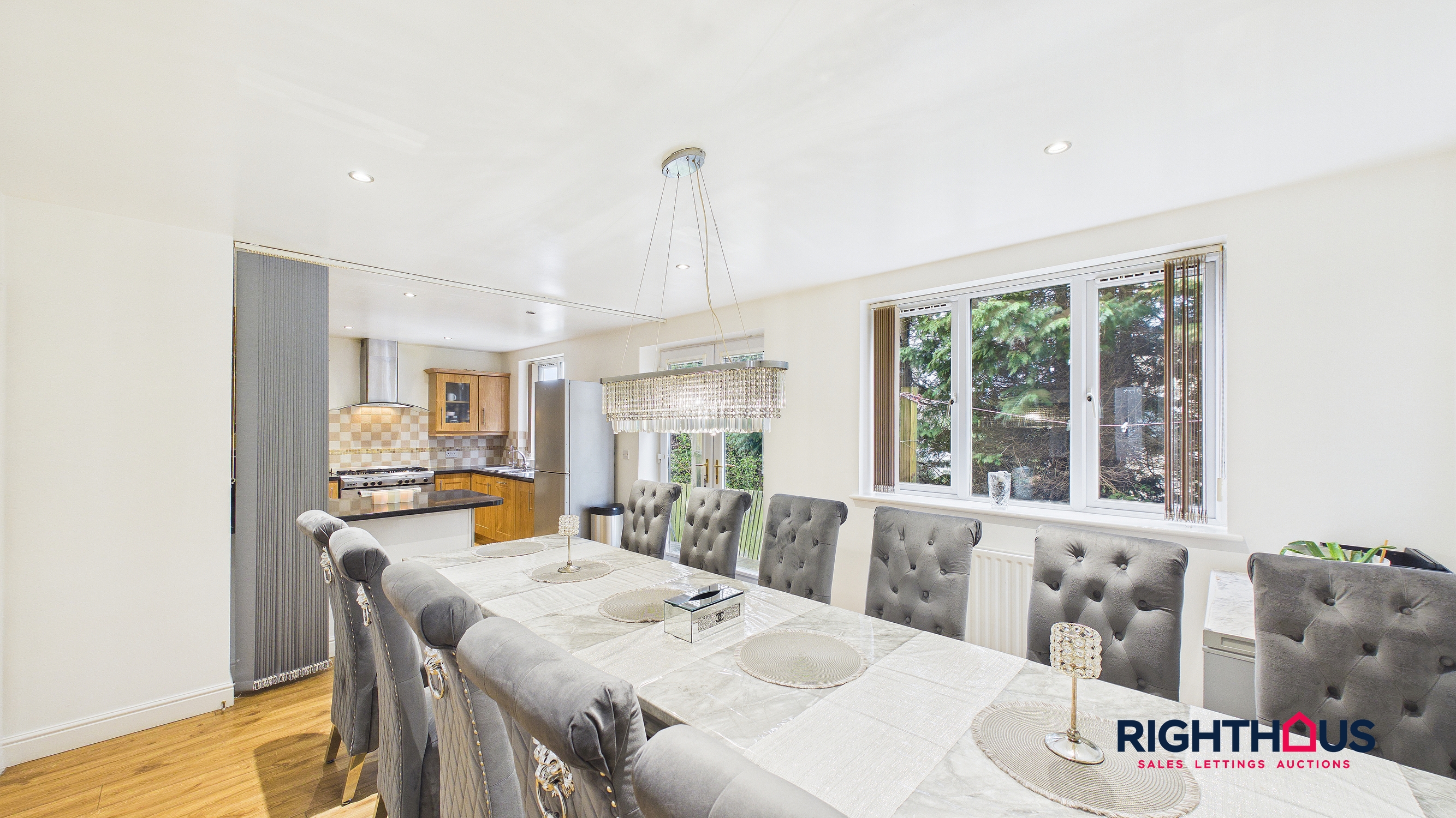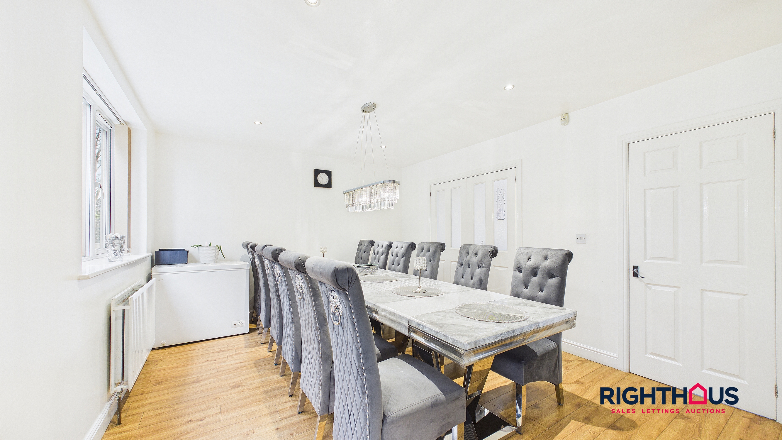 A particularly good sized open aspect kitchen with dining area. The kitchen is presented with a range of wall and base units as well as a good amount of counter workspace, 1 bowl sink unit with drainer. Space for Range style oven. Extractor hood and complimentary splashback tiling. The dining area features dual patio doors giving access to the rear garden.