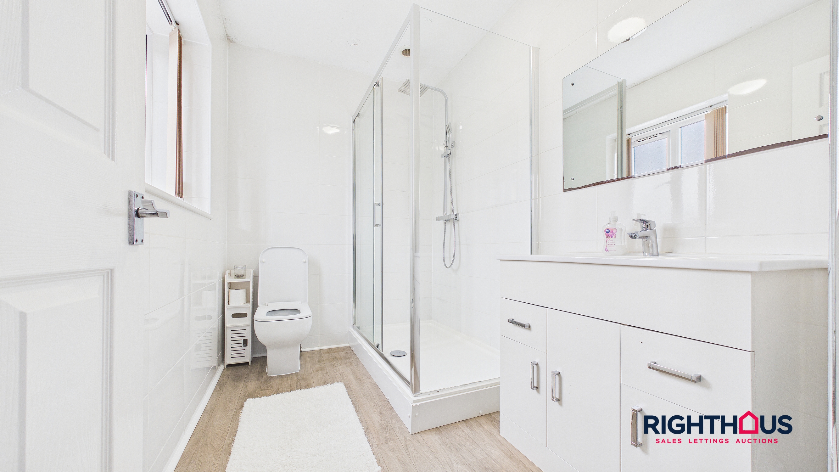 Tiled en suite shower room comprising of 3 piece suite including low level W.C., double vanity storage unit with inset basin and double walk in shower cubicle. Fully tiled walls.