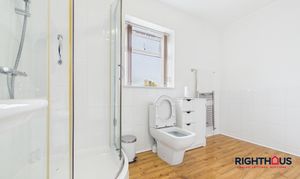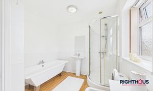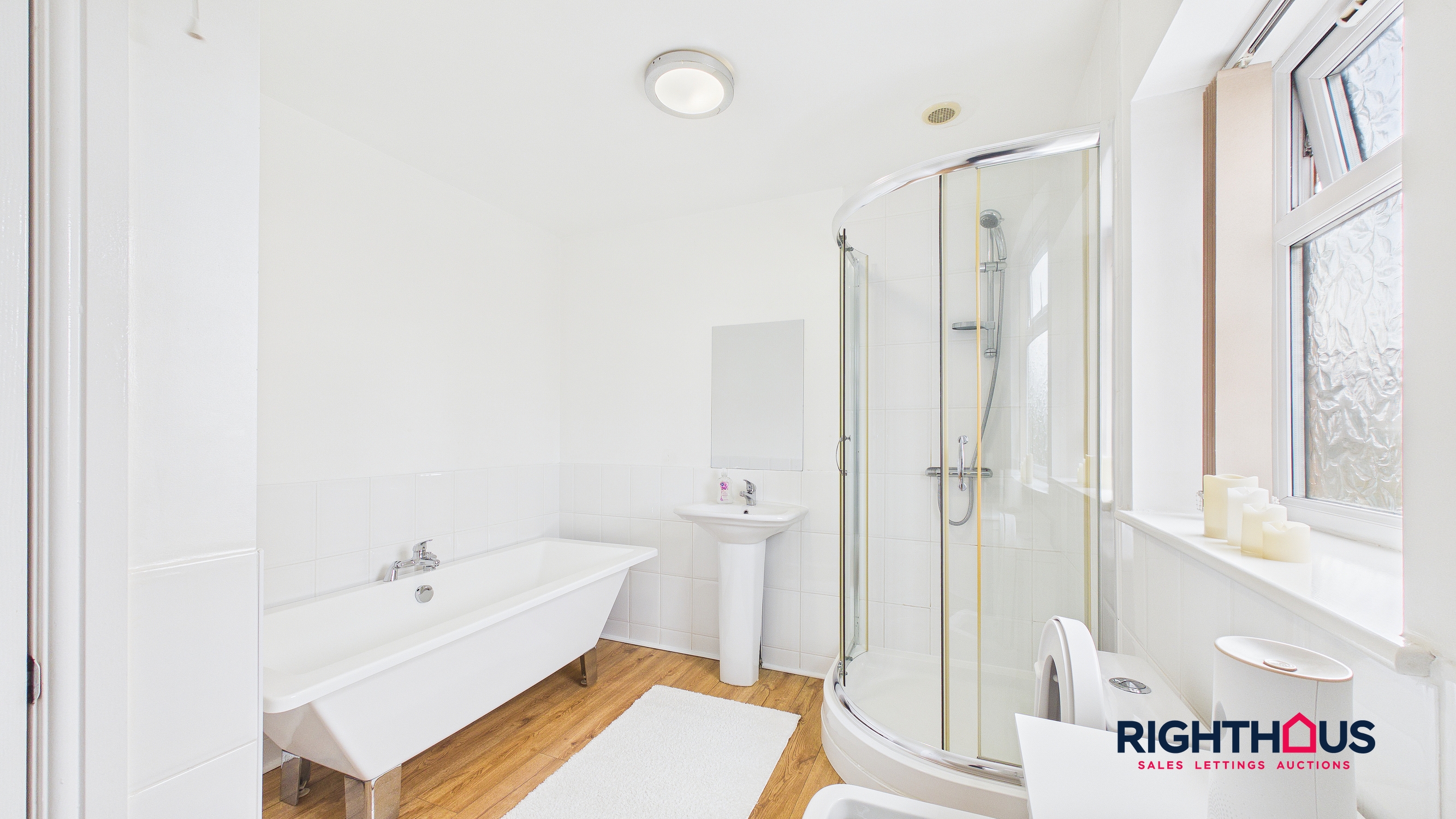 Part tiled family bathroom comprising of 4 piece suite including free standing bath, low level W.C., pedestal hand basin and large corner shower cubicle.