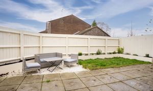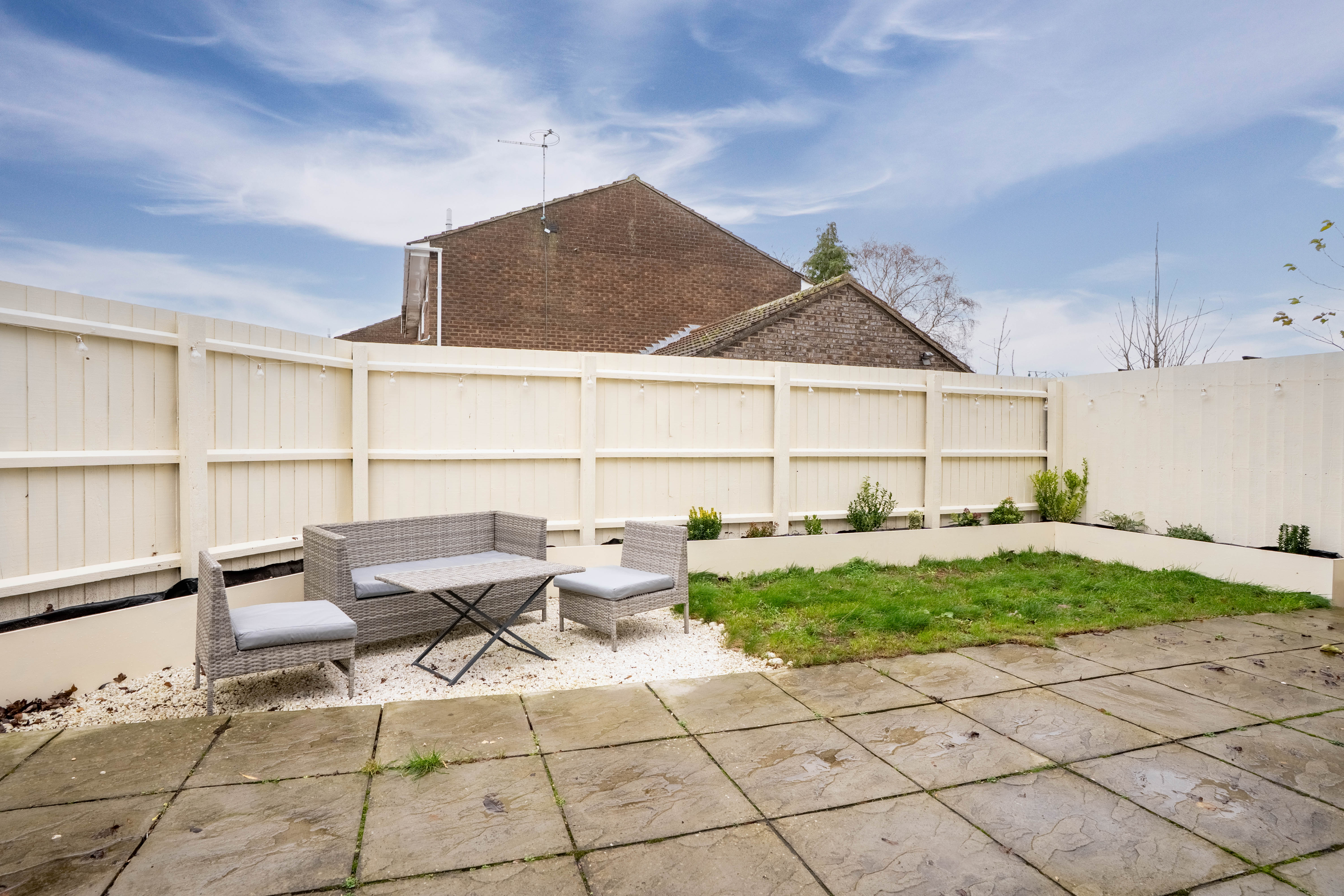 The rear garden is fully enclosed with panel fencing and includes a patio area, gated rear access and a block-paved driveway beyond.