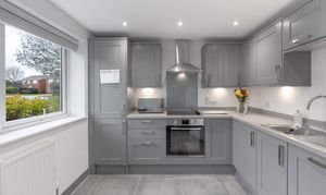 The kitchen features a double-glazed window to the front aspect, a double panelled radiator, and a modern range of base and wall-mounted units with work surfaces over. Integrated appliances include an electric oven and hob, fridge/freezer, washing machine and dishwasher, with a cupboard housing the combination boiler.