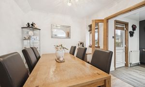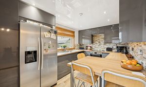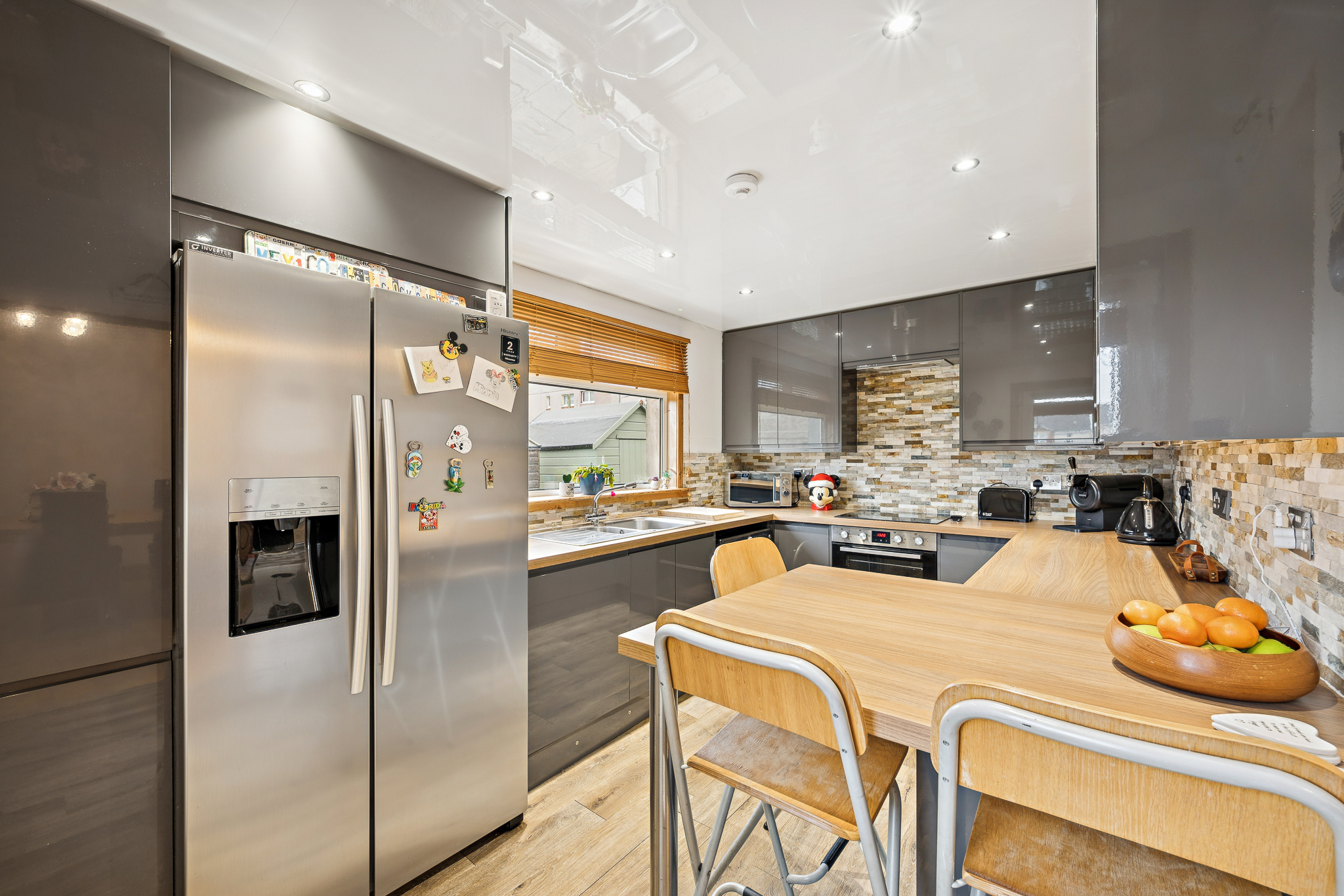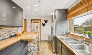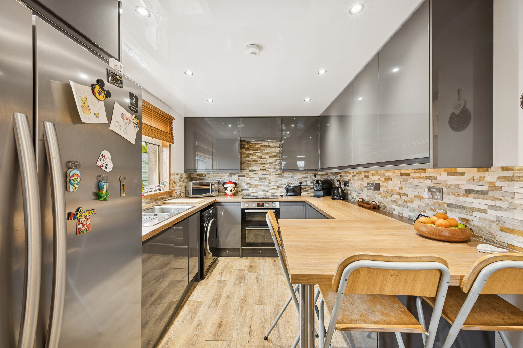 To the rear of the property, the stylish kitchen forms part of a modern extension. Finished with sleek dark grey gloss cabinetry and wooden-style worktops, this impressive space is both functional and visually appealing. The kitchen includes a four-point induction hob with integrated oven and grill, integrated dishwasher, space for a washing machine and a convenient breakfast bar. With plenty of worktop and storage space, it’s perfectly designed for busy households and keen cooks alike.