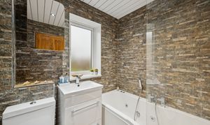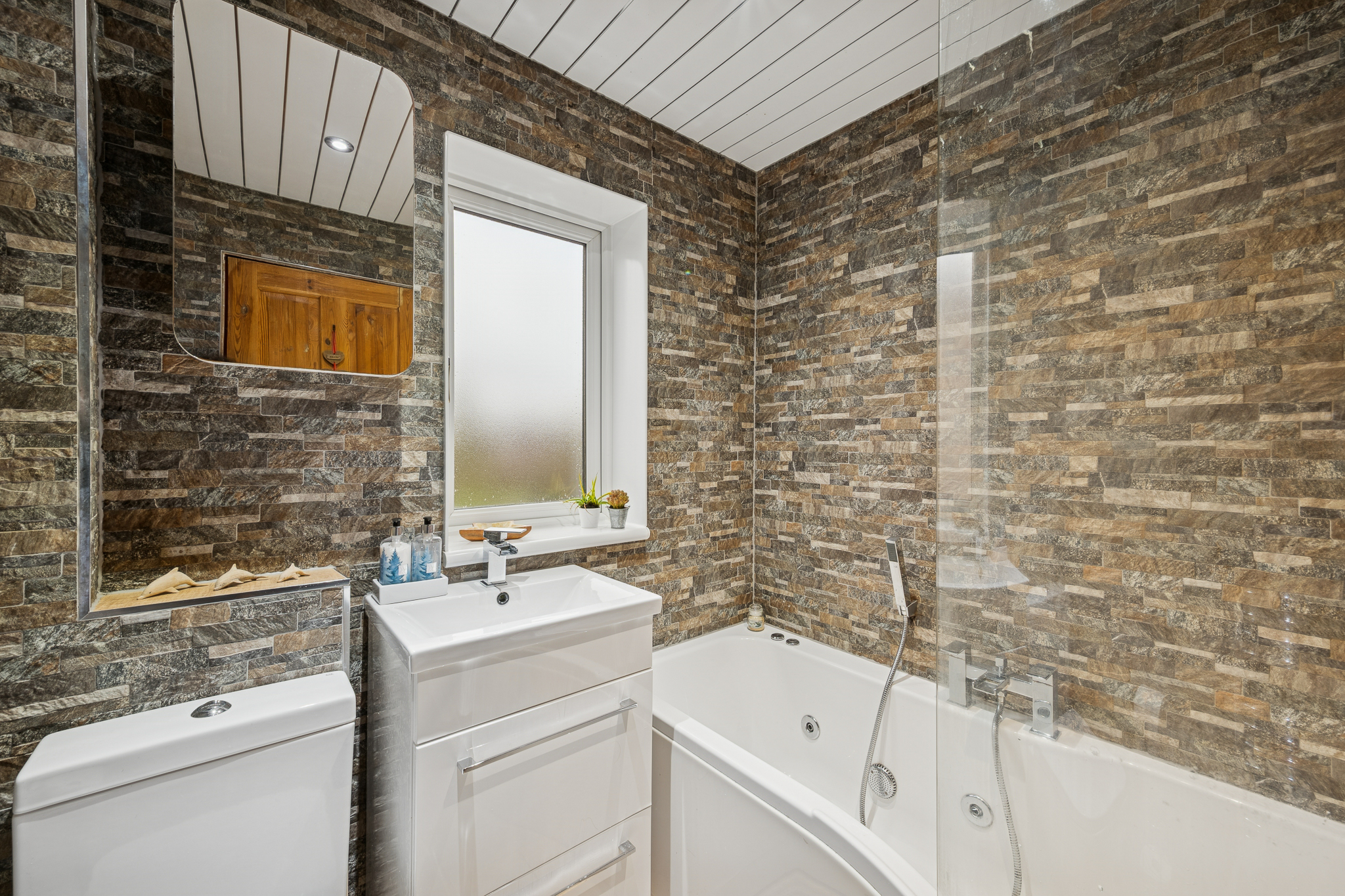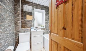The family bathroom is stylishly finished with full tiling, white gloss cabinetry, a chrome heated towel rail and a three-piece suite consisting of a bathtub with overhead shower, creating a fresh, clean and practical space.