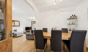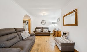As you enter the home, you are welcomed into a bright hallway with a useful storage cupboard directly ahead perfect for keeping coats, shoes and everyday essentials neatly tucked away. To the right, the open-plan lounge and dining area offer an impressive sense of space. The lounge can easily accommodate two large sofas and a media wall, creating a perfect environment for relaxing or entertaining. The adjoining dining area provides room for a six-seater table, making family meals and hosting effortless. A large front-facing window fills the space with natural light, giving the entire room a bright and inviting feel.