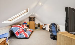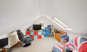 A staircase leads to the loft conversion, a fantastic additional room offering complete versatility. Currently used as a games room, it can easily serve as a third bedroom, home office, studio or playroom. The space features a skylight window for natural light and retains accessible storage areas within the eaves, making it both functional and flexible.