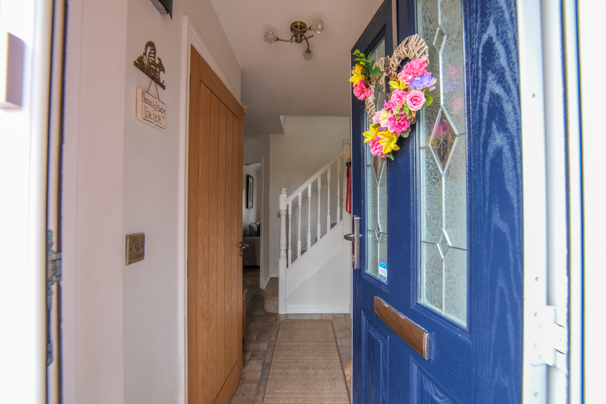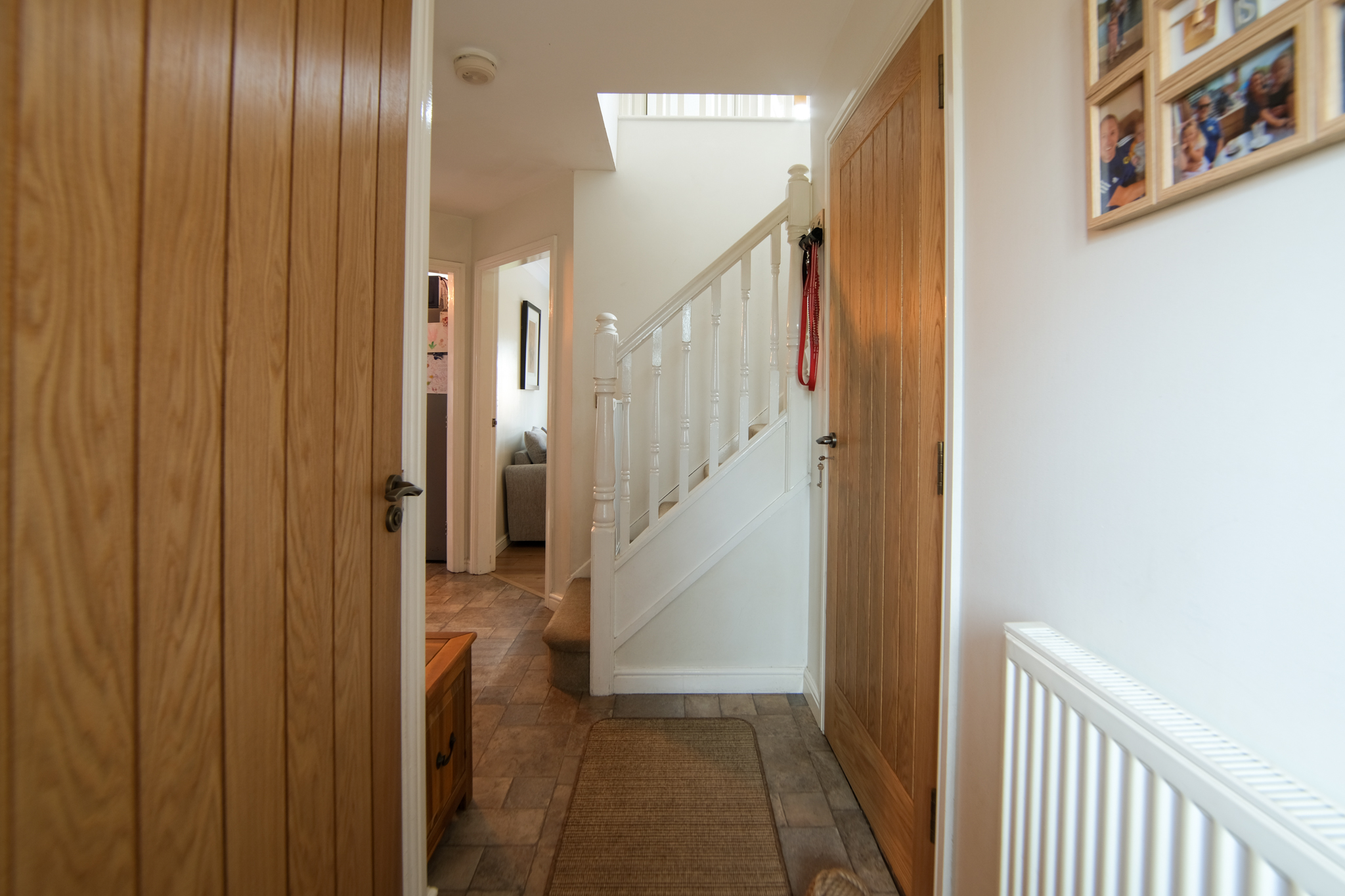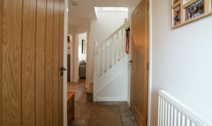Radiator, tile-effect laminate flooring, staircase to first floor and doors to;