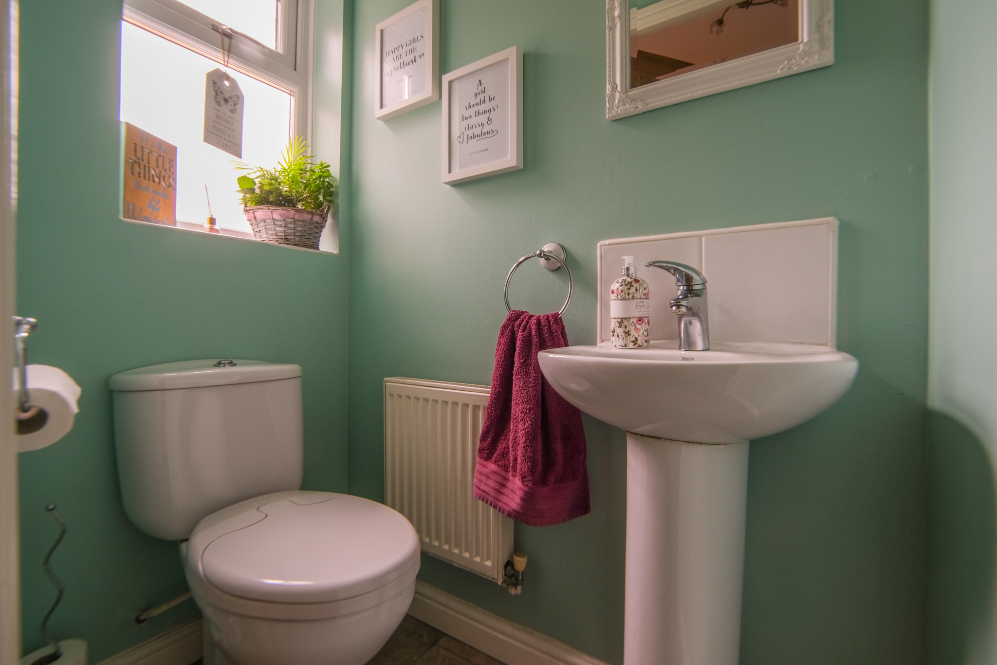 Window to front, radiator, tile-effect laminate flooring, W.C and pedestal washbasin with tiled splashback.