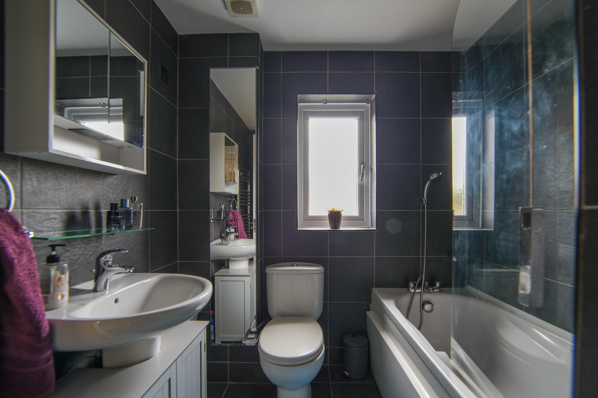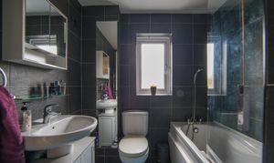 Window to rear, heated towel rail, fully tiled. W.C, pedestal washbasin and bath with plumbed in shower over and shower screen.