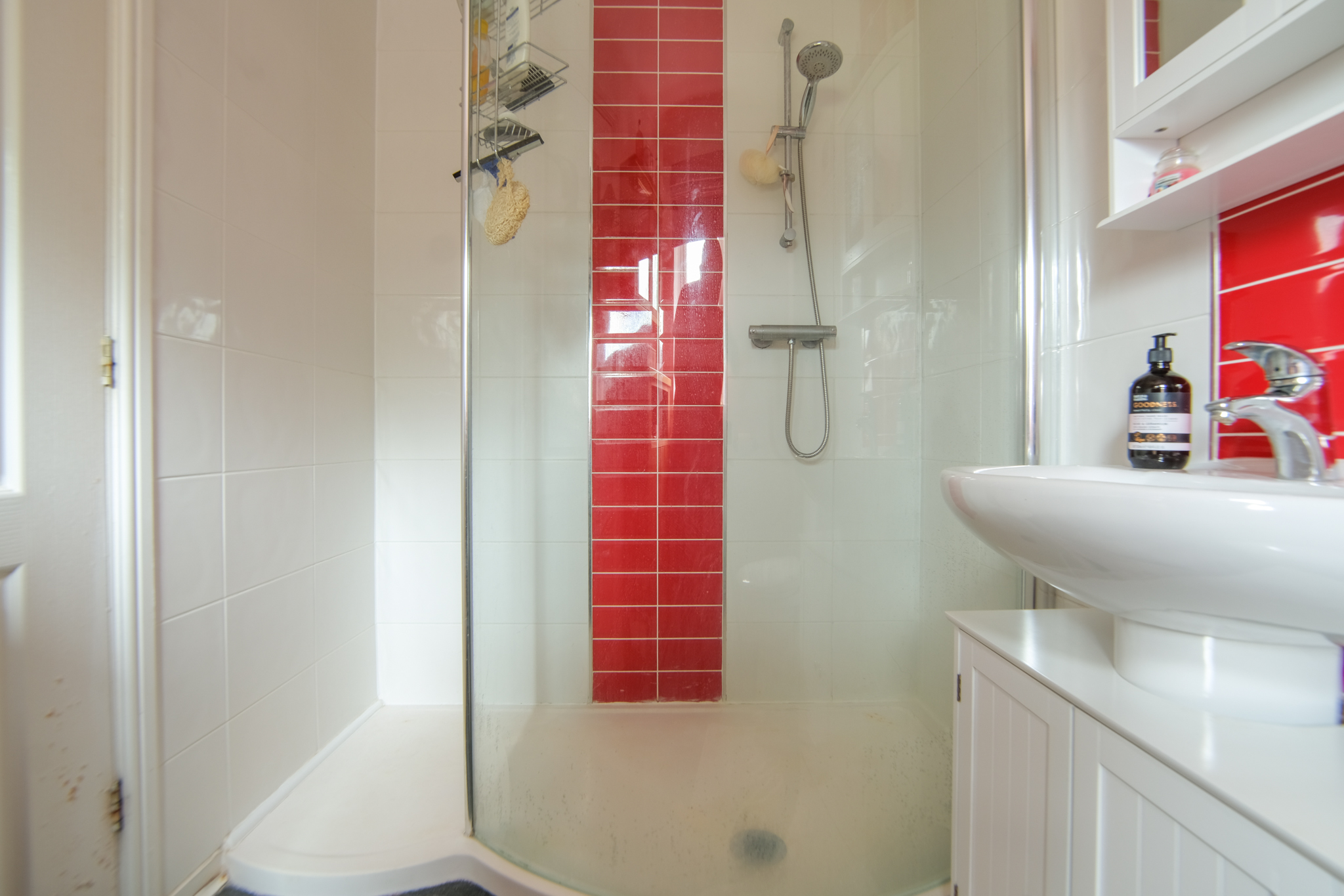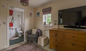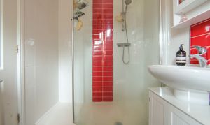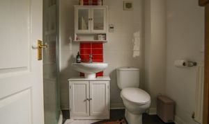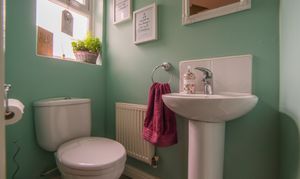 Window to front, radiator, tile-effect laminate flooring, W.C, pedestal washbasin with tiled splashback, shower cubicle, shaver point and extractor fan.