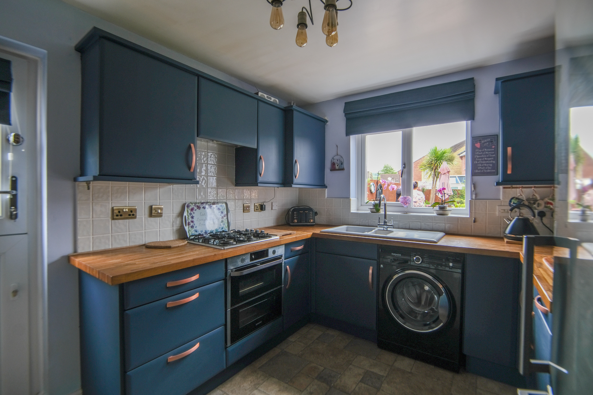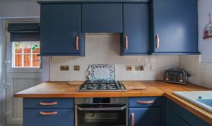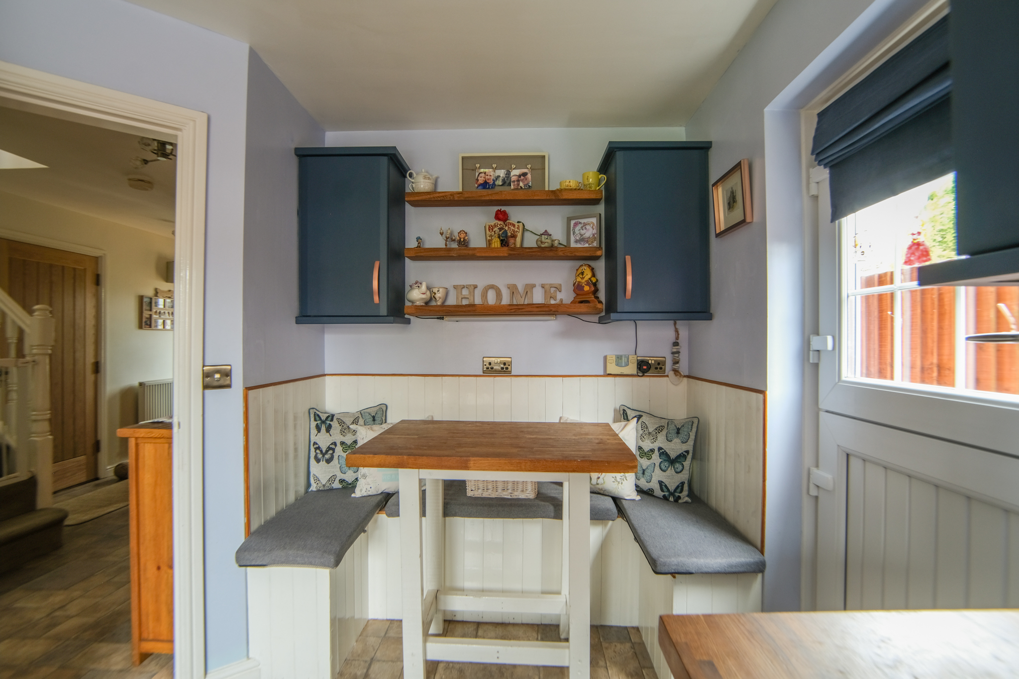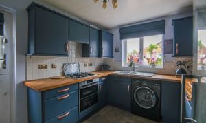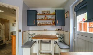Window to rear, stable style door to side, tile-effect laminate flooring, fitted with a range of wall & base units with tiled splashbacks, porcelain sink & drainer unit with stainless steel mixer tap, plumbing for washing machine, oven with gas hob & cooker hood over, cupboard housing boiler, space for fridge / freezer and built-in breakfast bar.