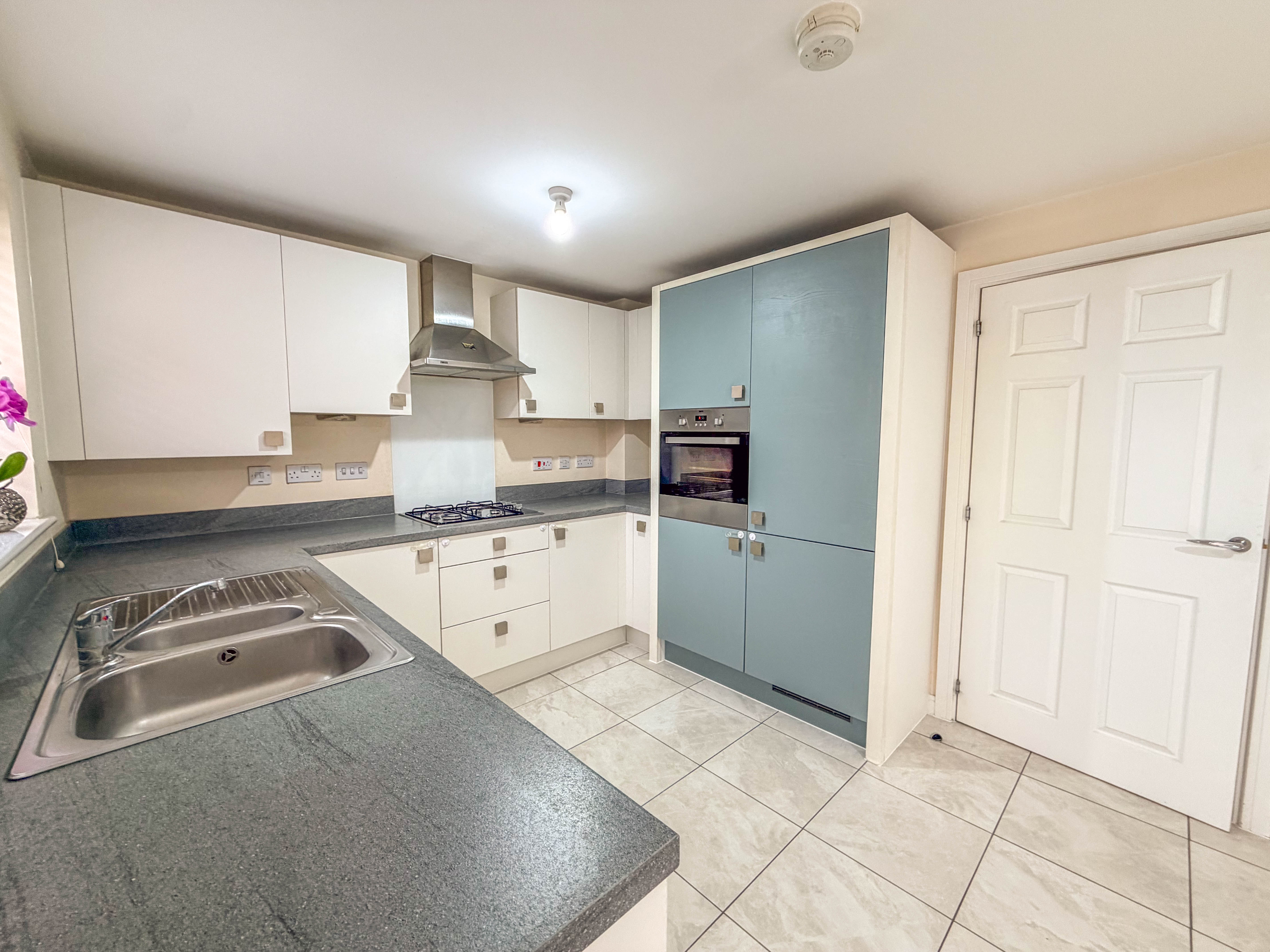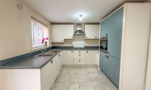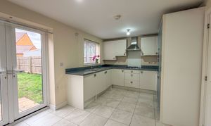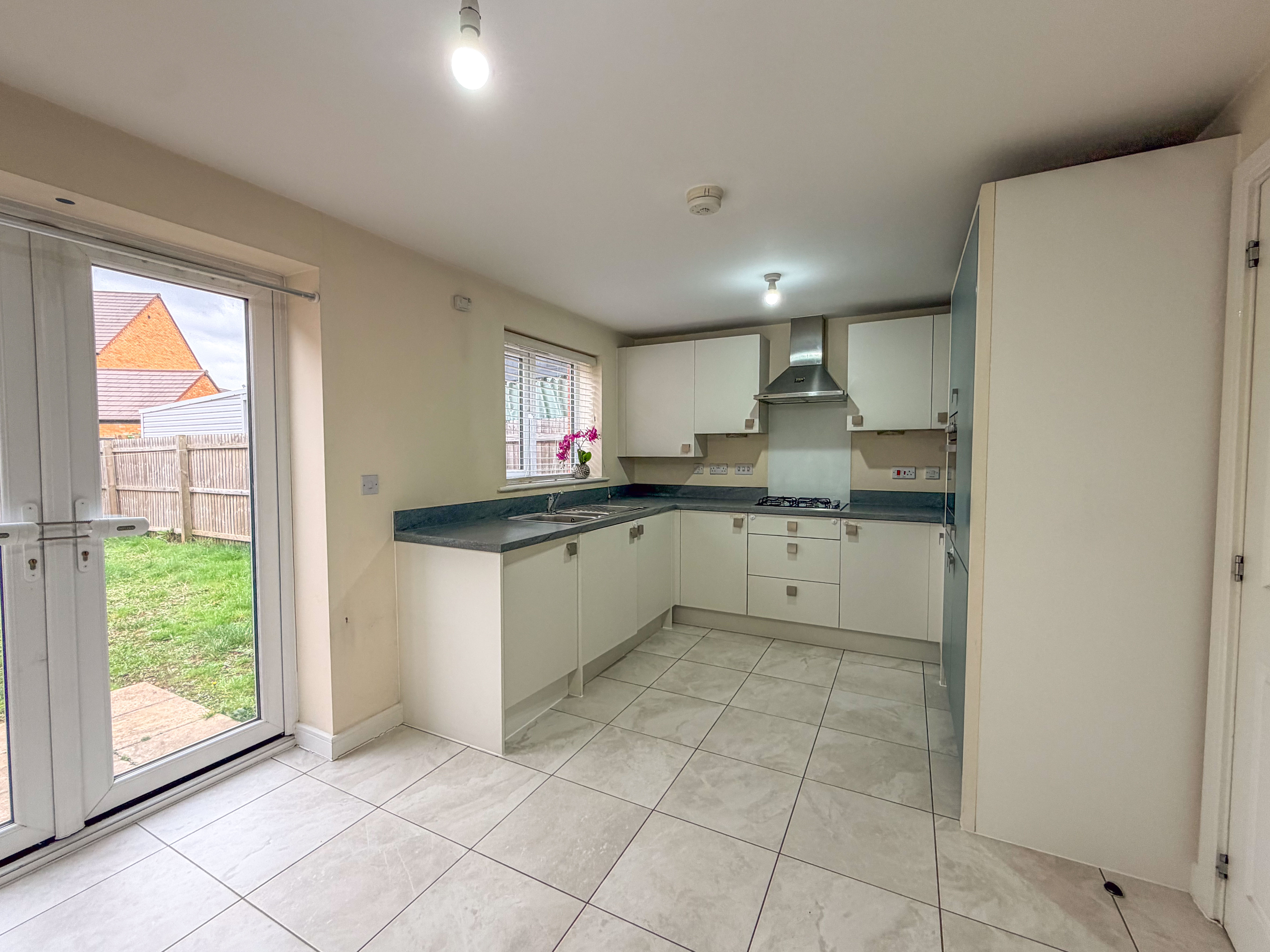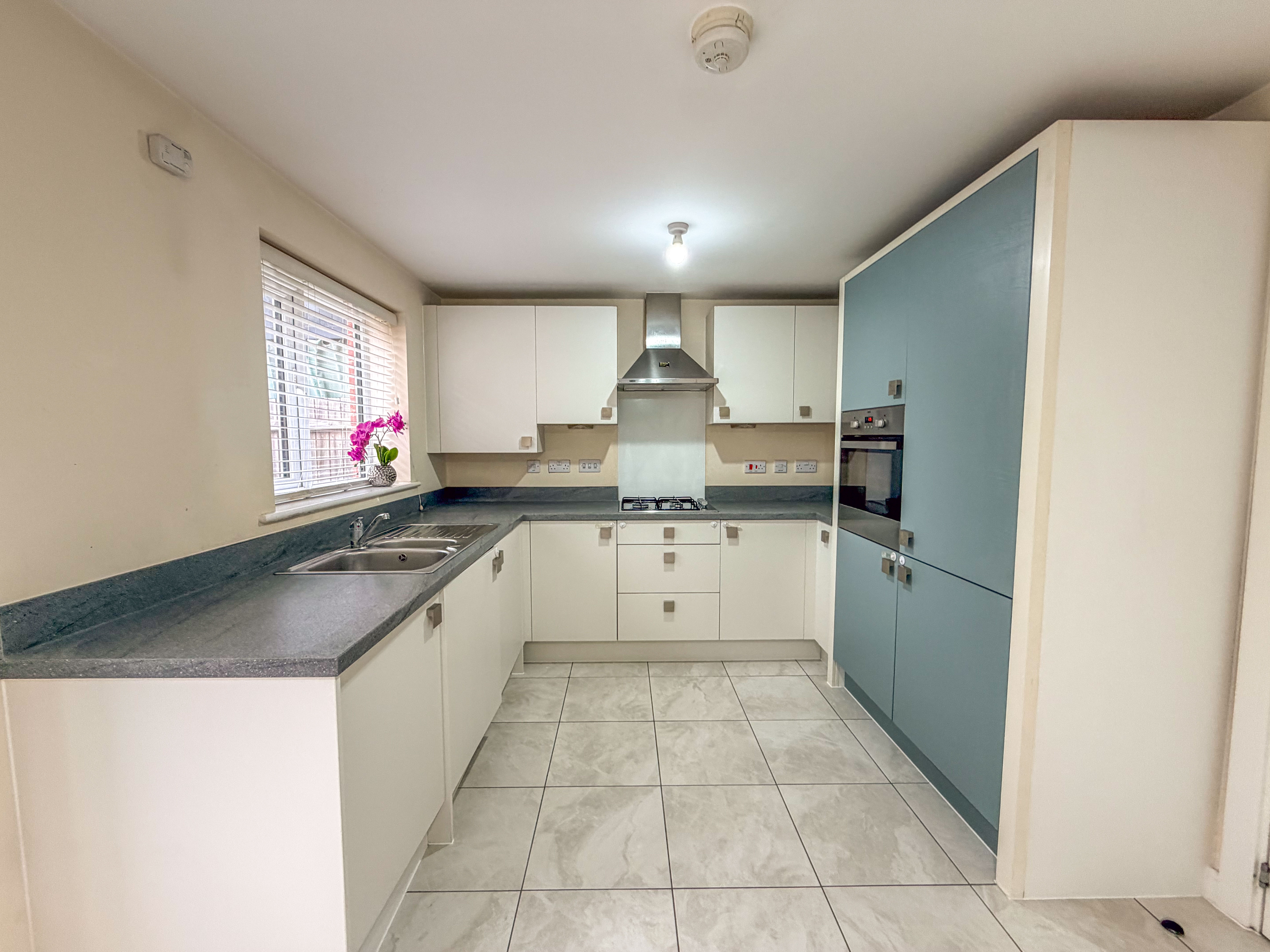 The real showpiece of the property is the stunning open-plan kitchen/dining area. Fitted with a sleek range of contemporary grey units, stylish work surfaces and integrated appliances, it provides a versatile space for both casual family meals and entertaining guests. Natural light floods the room, enhanced by double French doors that open onto the rear patio, creating a seamless connection between indoor and outdoor living.