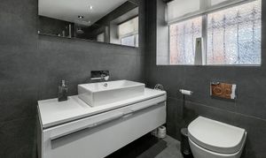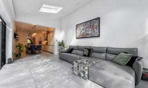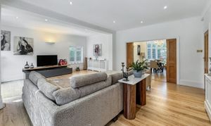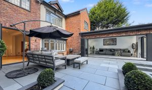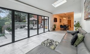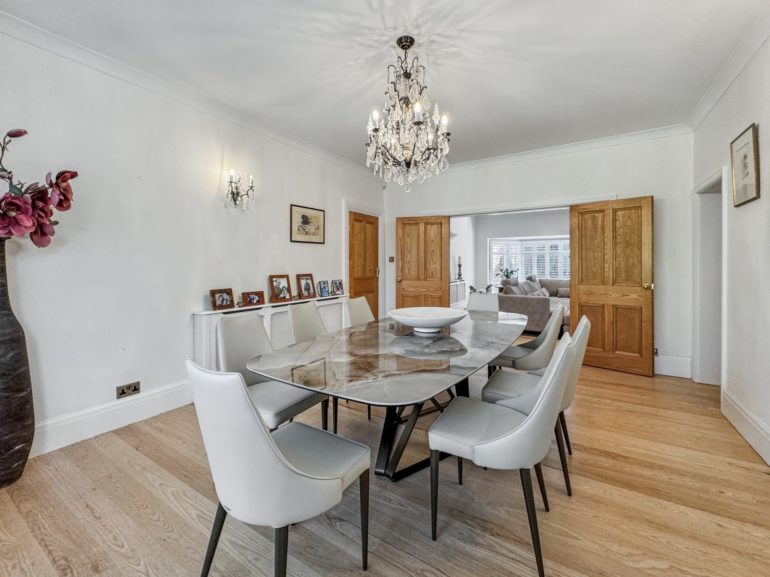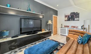 The main open-plan lounge continues this feeling of extraordinary space and flow, ideal for entertaining or simply relaxing with family. A second open-plan lounge, also benefitting from bi-folds, flows through to the formal dining room, crowned by a striking statement chandelier. Just off this space is a separate, more intimate lounge — perfect as a snug, TV room, or playroom — offering versatility to suit the needs of a growing family. A downstairs WC and convenient cloakroom storage complete the ground floor.