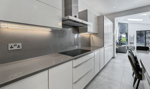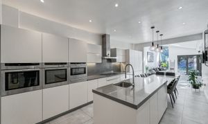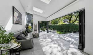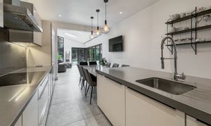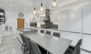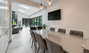The heart of the home is its spectacular kitchen — a true centrepiece featuring a large central island, integrated appliances, and a breakfast table that comfortably seats eight, perfect for casual dining or hosting friends. This light-filled space opens into a stylish living area with seven bi-fold doors leading onto an outstandingly beautiful garden, creating a remarkable sense of openness and a seamless connection between indoors and out.