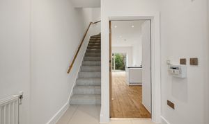From the moment you step inside, the sense of space is immediate. High ceilings and large windows flood the interiors with natural light, creating a bright and airy atmosphere throughout. The ground floor features a generous open plan reception space with a high specification fitted kitchen, ideal for entertaining or relaxed everyday living. Doors open directly onto a peaceful south facing rear garden, perfect for morning coffee or long summer evenings. A guest WC and useful under stairs storage complete the level.