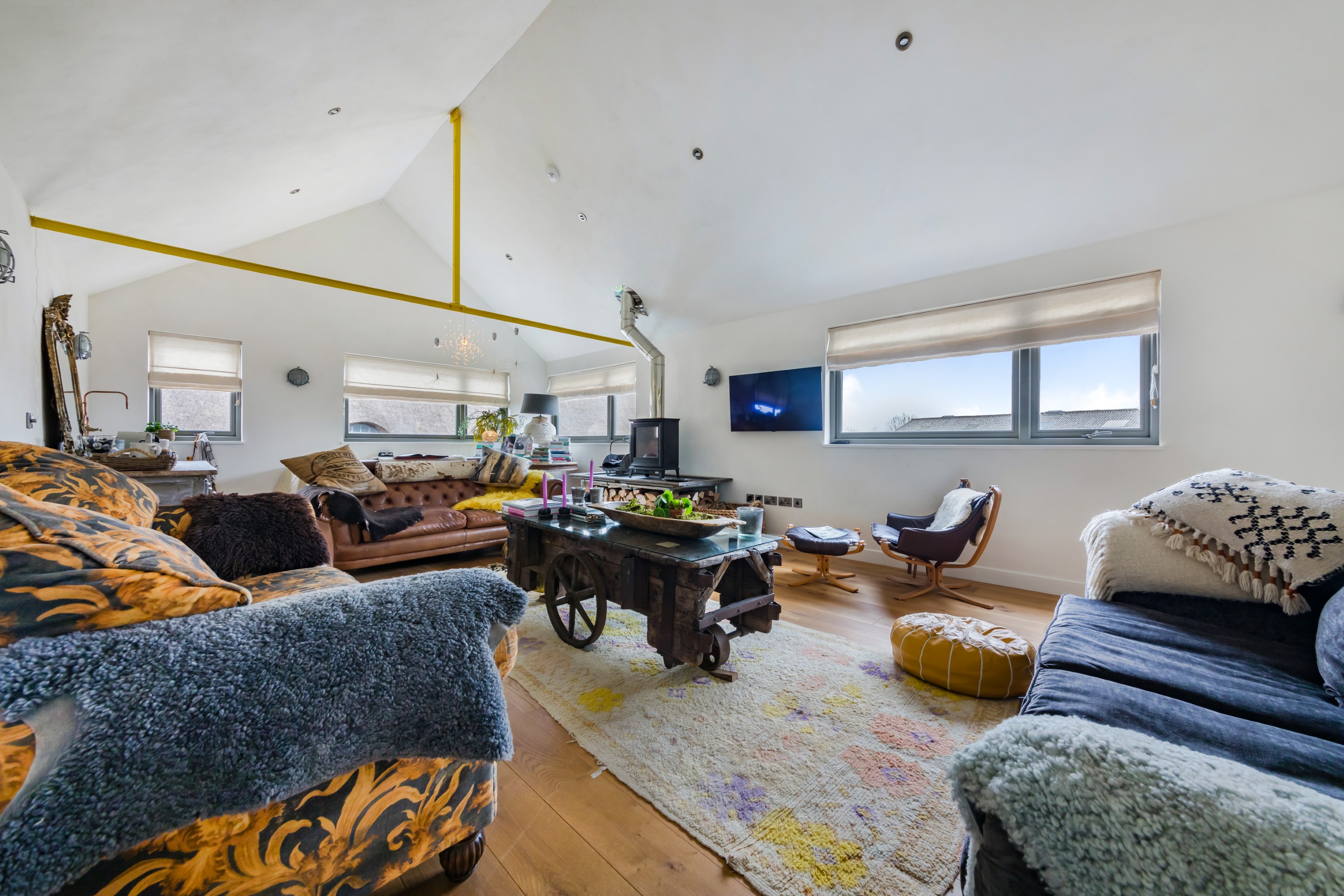 FIRST FLOOR SITTING ROOM- Measuring a more than generous 32ft the dual aspect room features seven windows each enjoying views over the gardens and neighbouring tythe barn. The reception room features a vaulted ceiling, wood burning stove and an almost galleried landing to the floor below with a glass walkway which leads to a hall leading to the bedroom quarters.