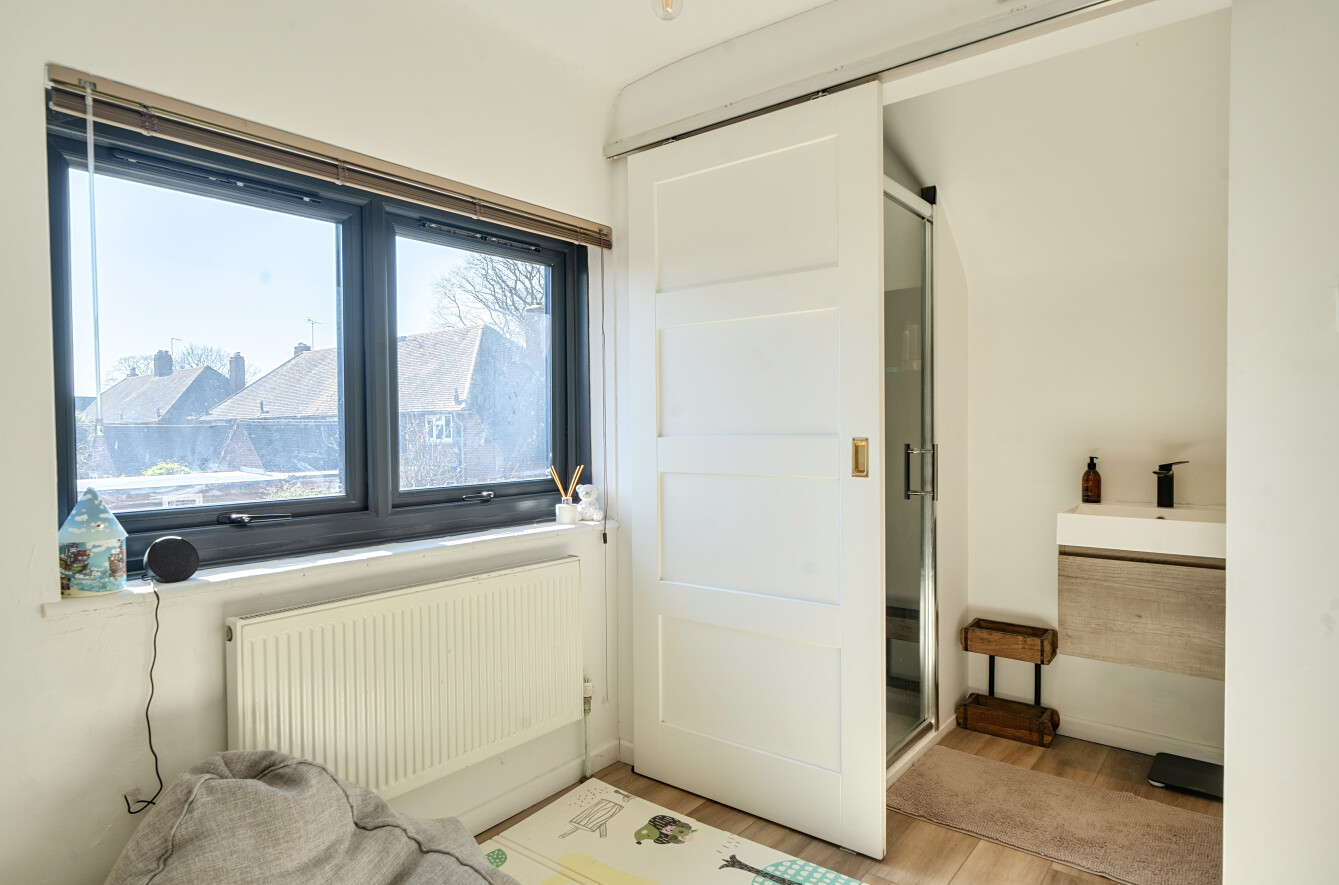 Upstairs, there are two well-proportioned bedrooms, both offering comfortable and versatile living space. One of the bedrooms has a sliding door to a modern en-suite shower room.