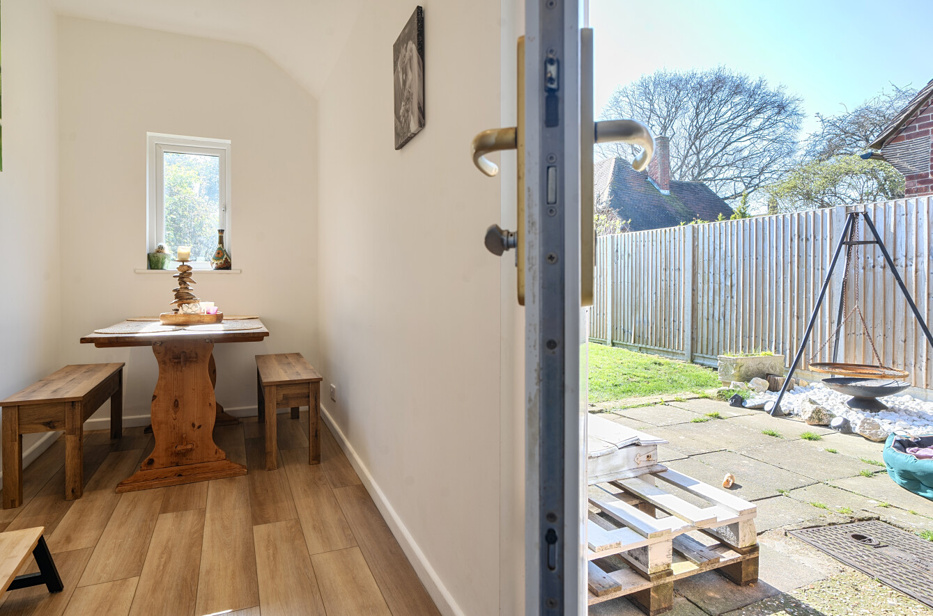 Outside, the garden provides a blank canvas for landscaping, currently laid with a patio and lawn, ideal for those looking to create their own outdoor retreat.