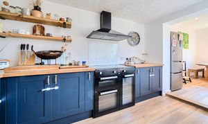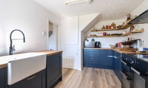 The accommodation comprises an entrance hall leading into a delightful dual-aspect sitting room, featuring a cosy wood burner. To the rear, a beautifully designed shaker-style kitchen boasts striking deep blue units, contrasting worktops, a butler sink and space for a range-style cooker. This space flows seamlessly into a bright dual-aspect dining area, perfect for entertaining. The ground floor also benefits from a refitted contemporary bathroom, complete with a freestanding bath.