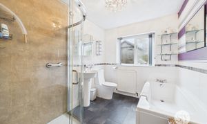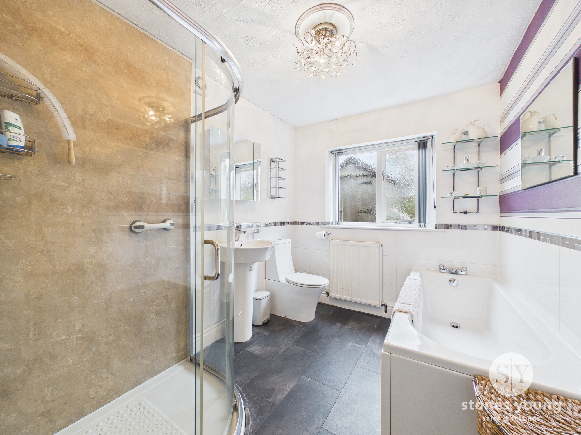 Laminate flooring, four piece in white comprising of bath, shower enclosure with electric shower and mains fed shower, wc and basin, tiled splash backs, frosted double glazed uPVC window, panel radiator.