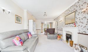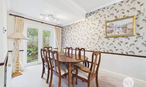 Carpet flooring, ceiling coving, dado rail, electric fire, space for dining table, double glazed uPVC window and French doors leading out to garden, x2 panel radiator.