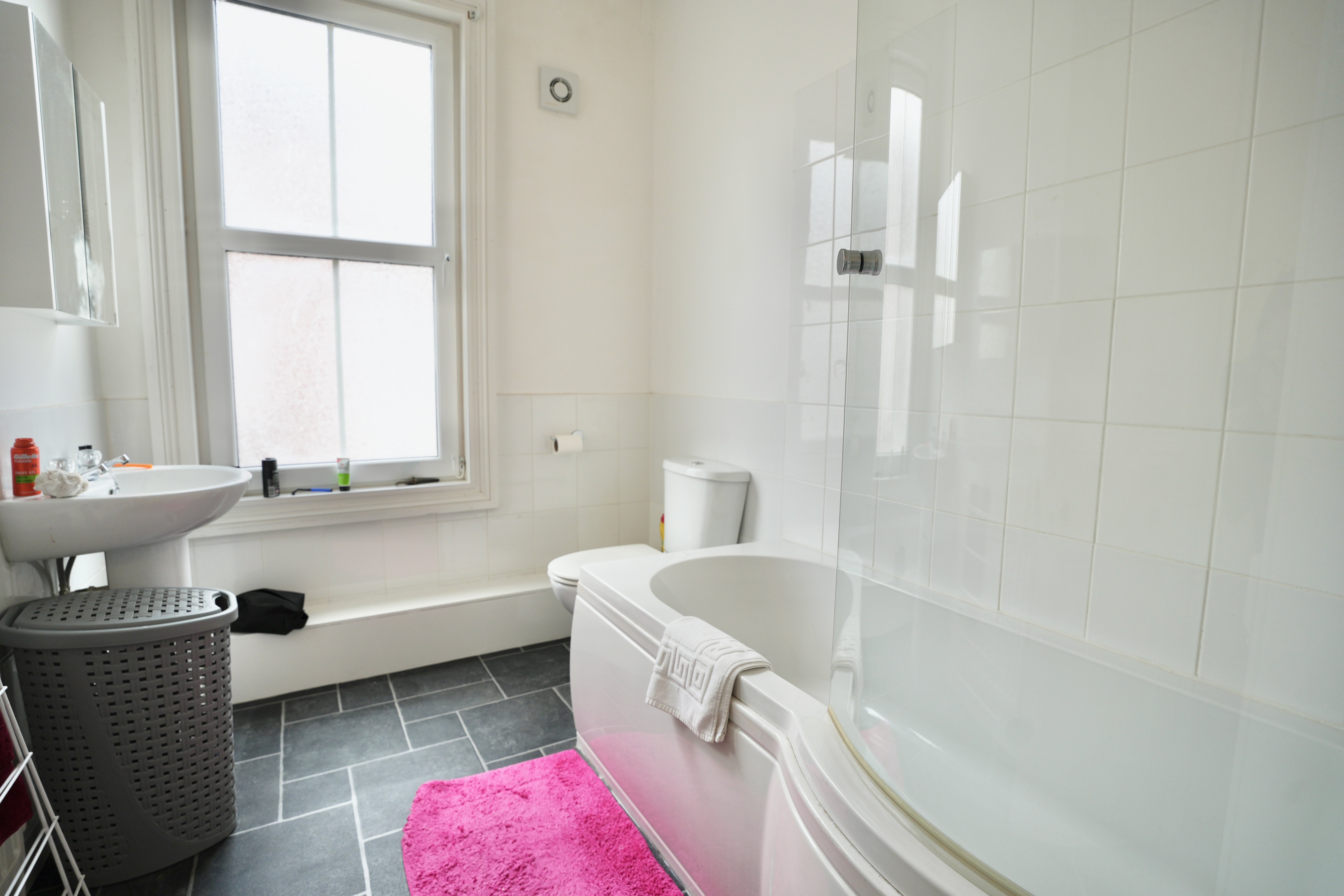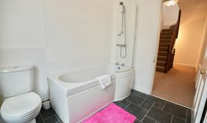 uPVC obscure double glazed window to the front aspect, tile effect vinyl flooring, part tiled walls, extractor fan, wall mounted radiator, dual flush WC, pedestal wash hand basin, P-shaped bath with shower bar and glazed shower screen over.