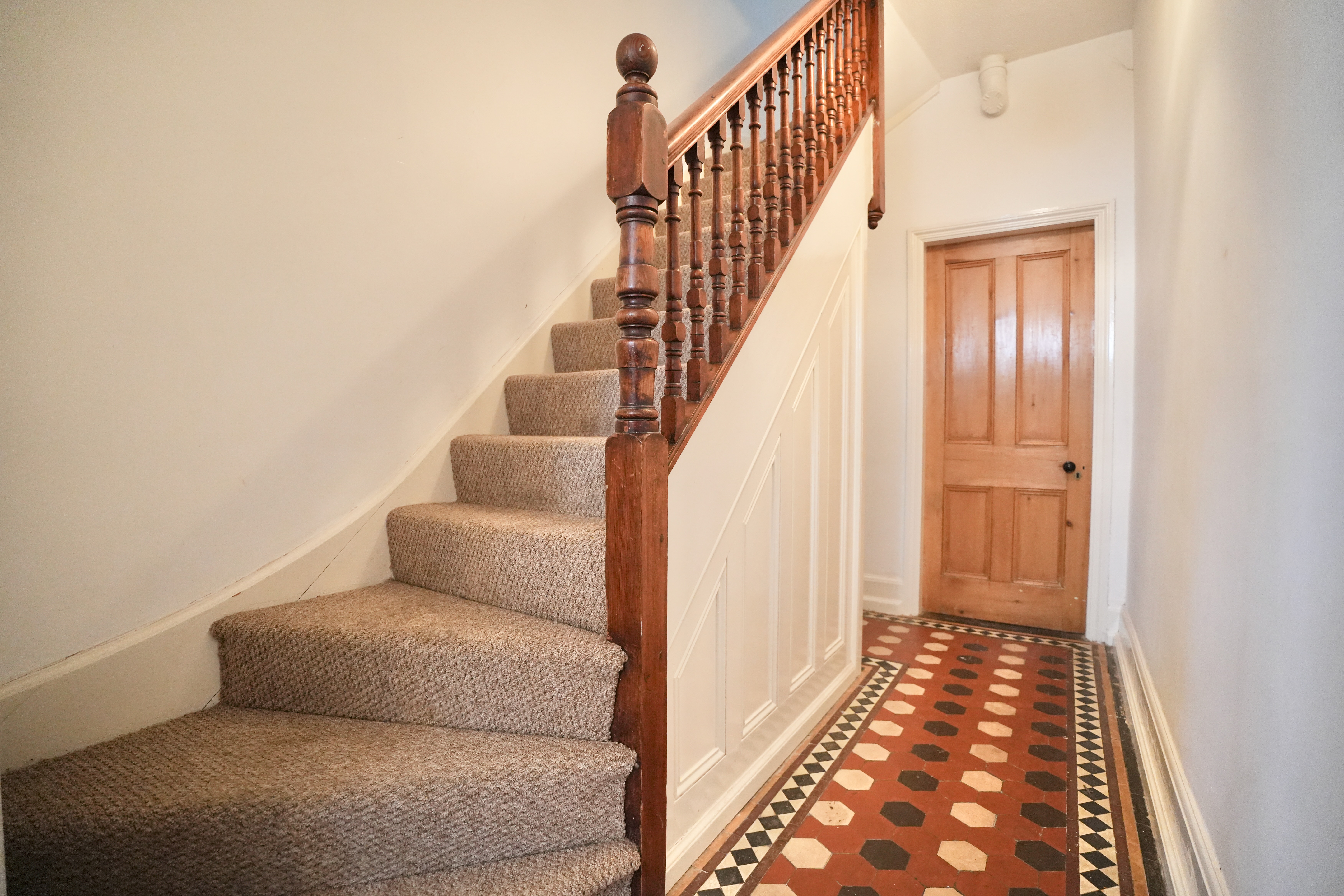 Carpeted flooring, wall mounted radiator, stairs rising to the second floor, doors to the lounge, bedroom 1 and the family bathroom.