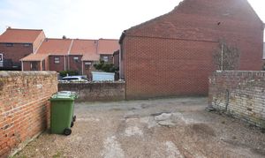 Fully enclosed with high-level brick wall and timber fencing, paved patio area and a timber gate opening to the parking area.