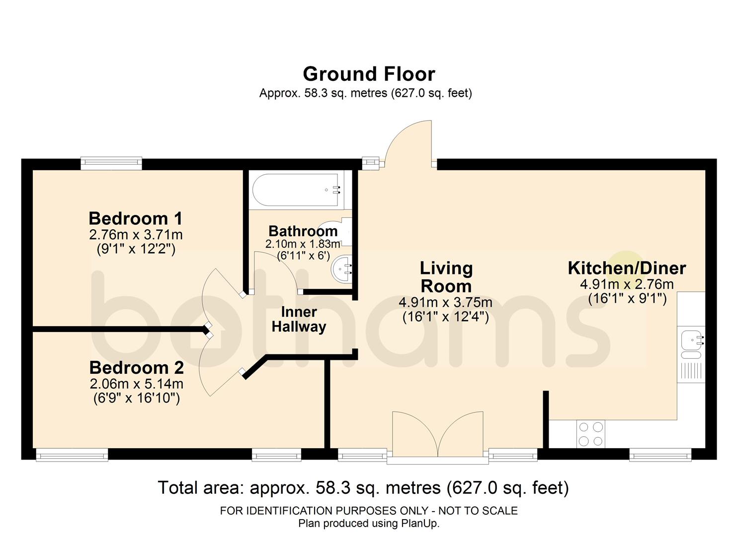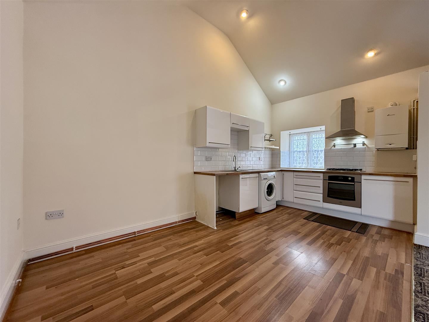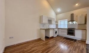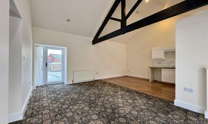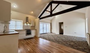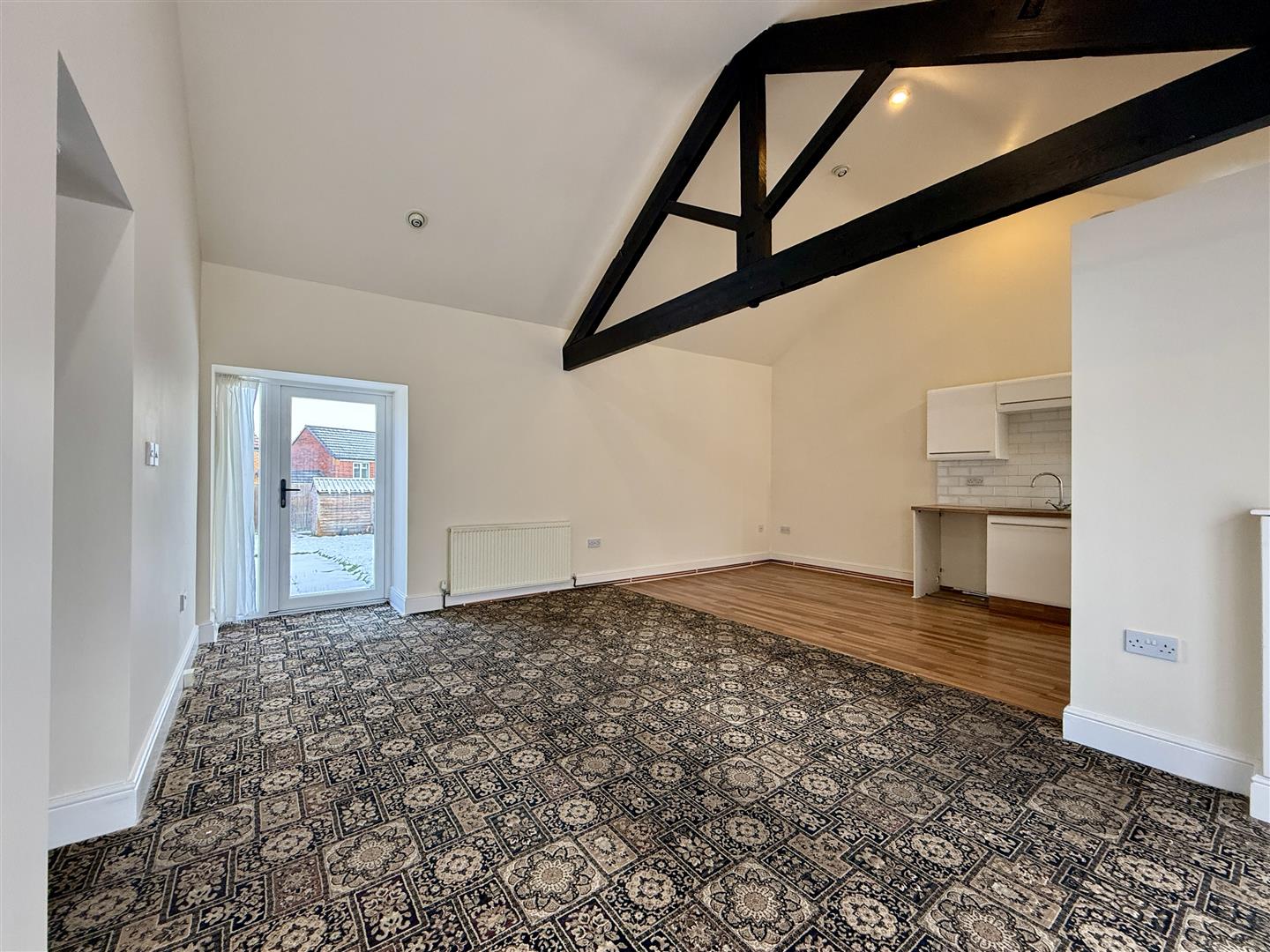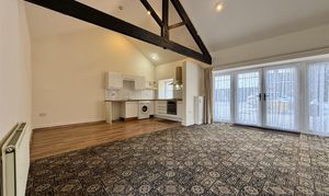 A full-height glazed entrance opens into an impressive open-plan kitchen/living/dining space with a vaulted ceiling and exposed beams, creating a bright centre to the home. French/bi-fold style doors draw you out to the garden for effortless indoor/outdoor living. An inner hall leads to two double bedrooms (the principal enjoying a rear outlook) and a modern family bathroom with shower over bath. The layout offers level, step-free accommodation that will suit downsizers, first-time buyers or those seeking a stylish pied-à-terre.