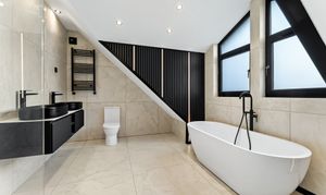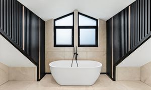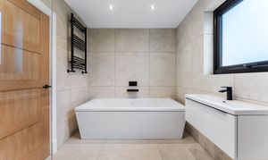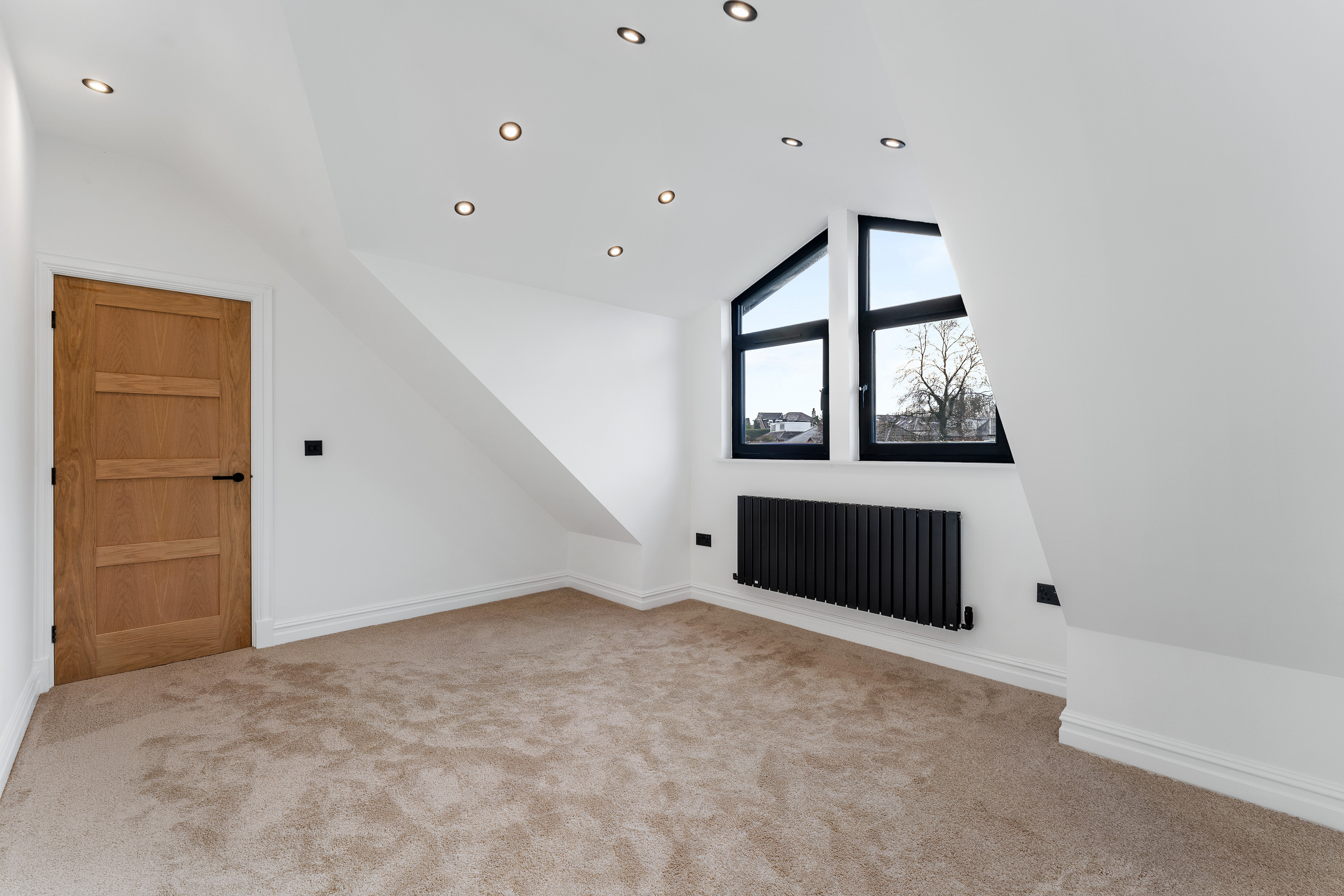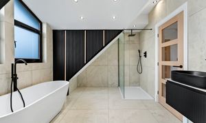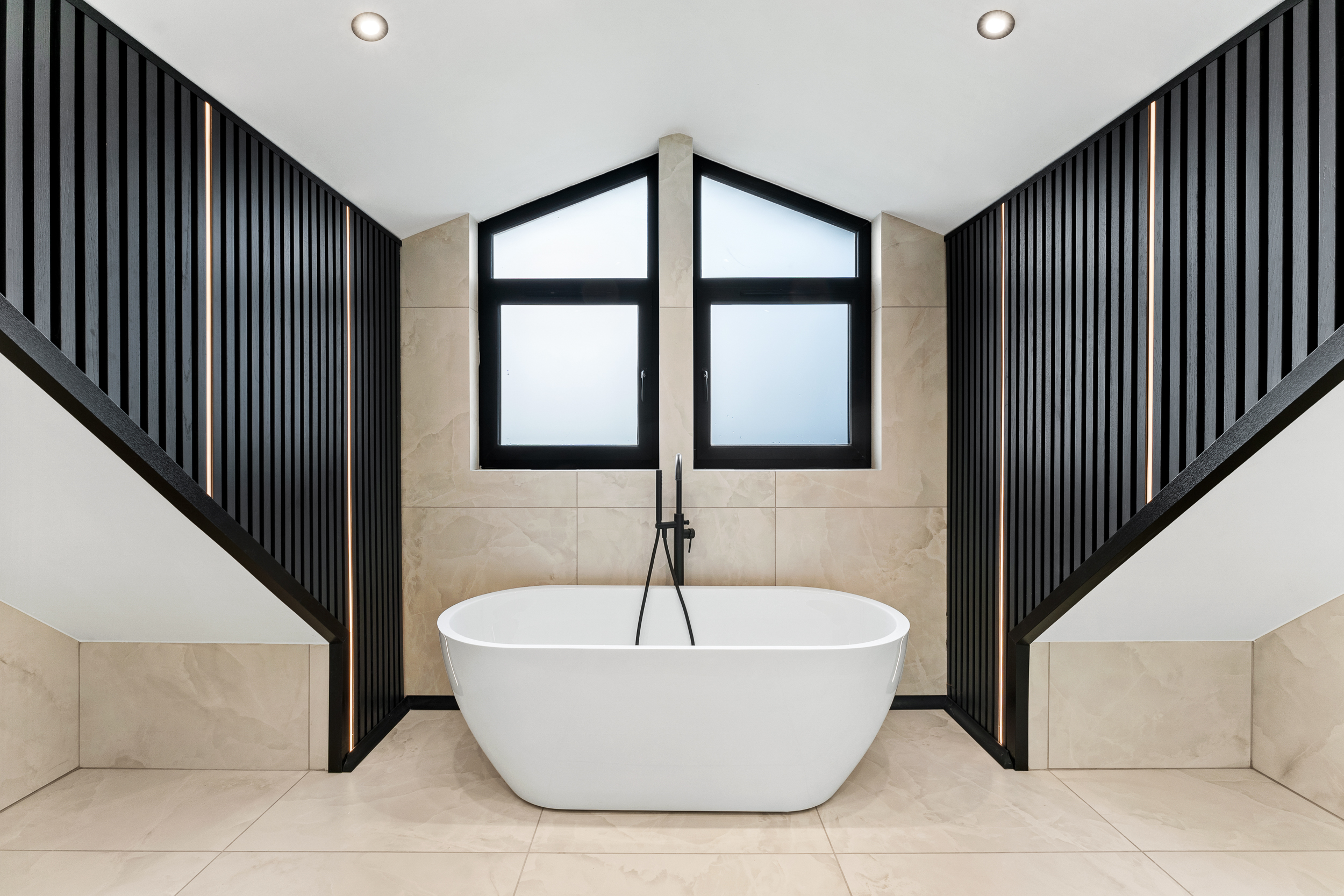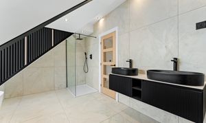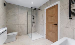 From the landing, the first floor leads to three further bedrooms and the family bathroom. The principal suite is a true highlight of the home, offering a calm, hotel-style retreat that has clearly been designed with both comfort and impact in mind. The bedroom itself is generously proportioned and flooded with natural light, while the en suite elevates the space to something special. Finished with large-format porcelain tiling, it features a striking freestanding bath positioned beneath contemporary dormer windows, creating a beautiful focal point. A walk-in rainfall shower with glass enclosure, twin wall-mounted basins set into a sleek floating vanity, and matt black fittings complete the look, while subtle feature lighting and vertical slatted detailing add texture and warmth. It’s a space that feels indulgent yet refined, perfect for unwinding at the end of the day.