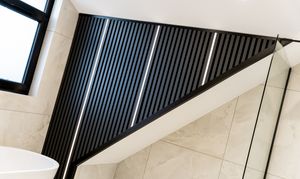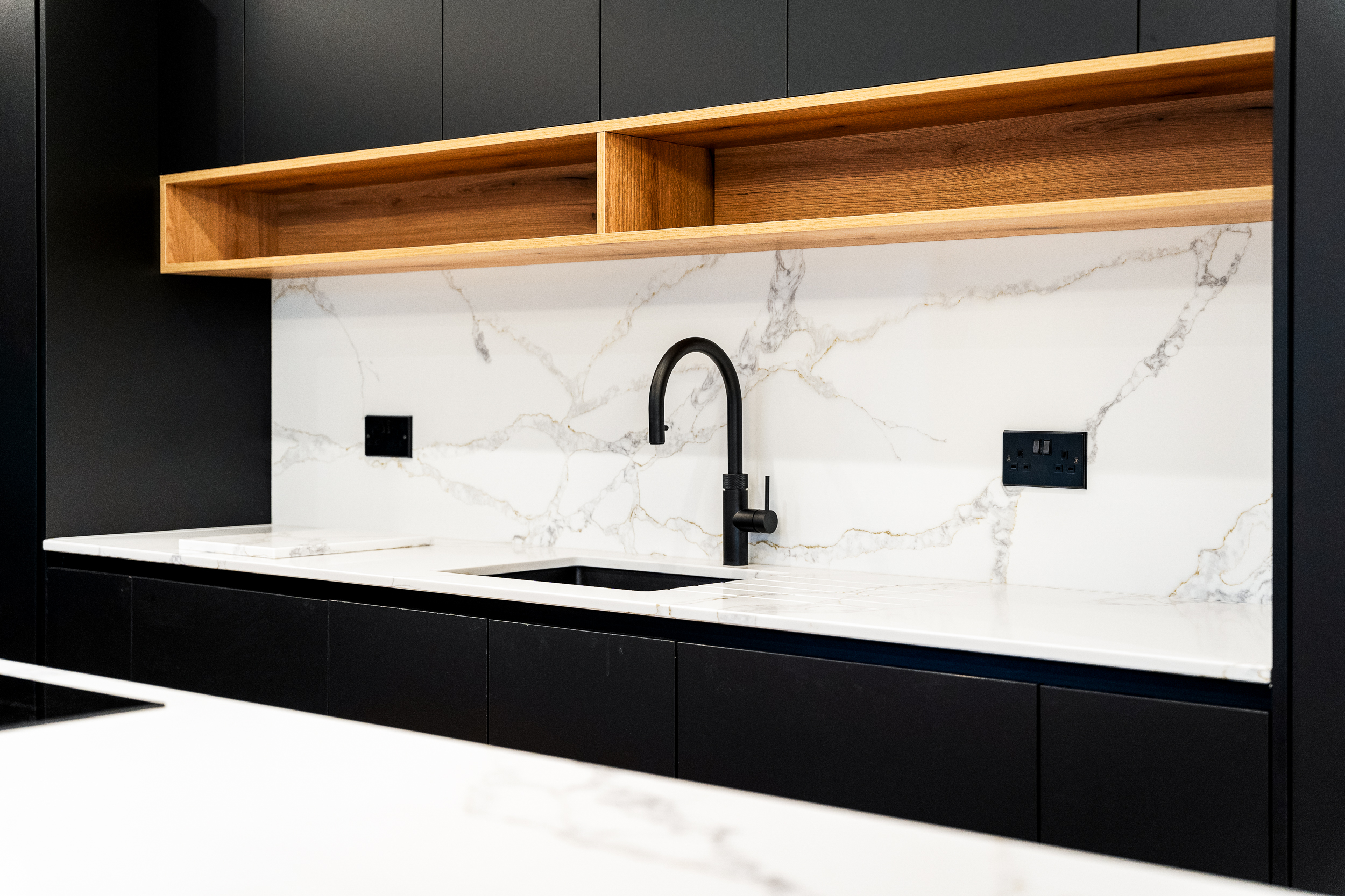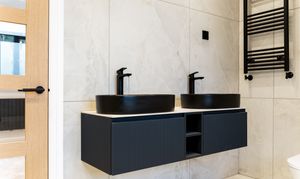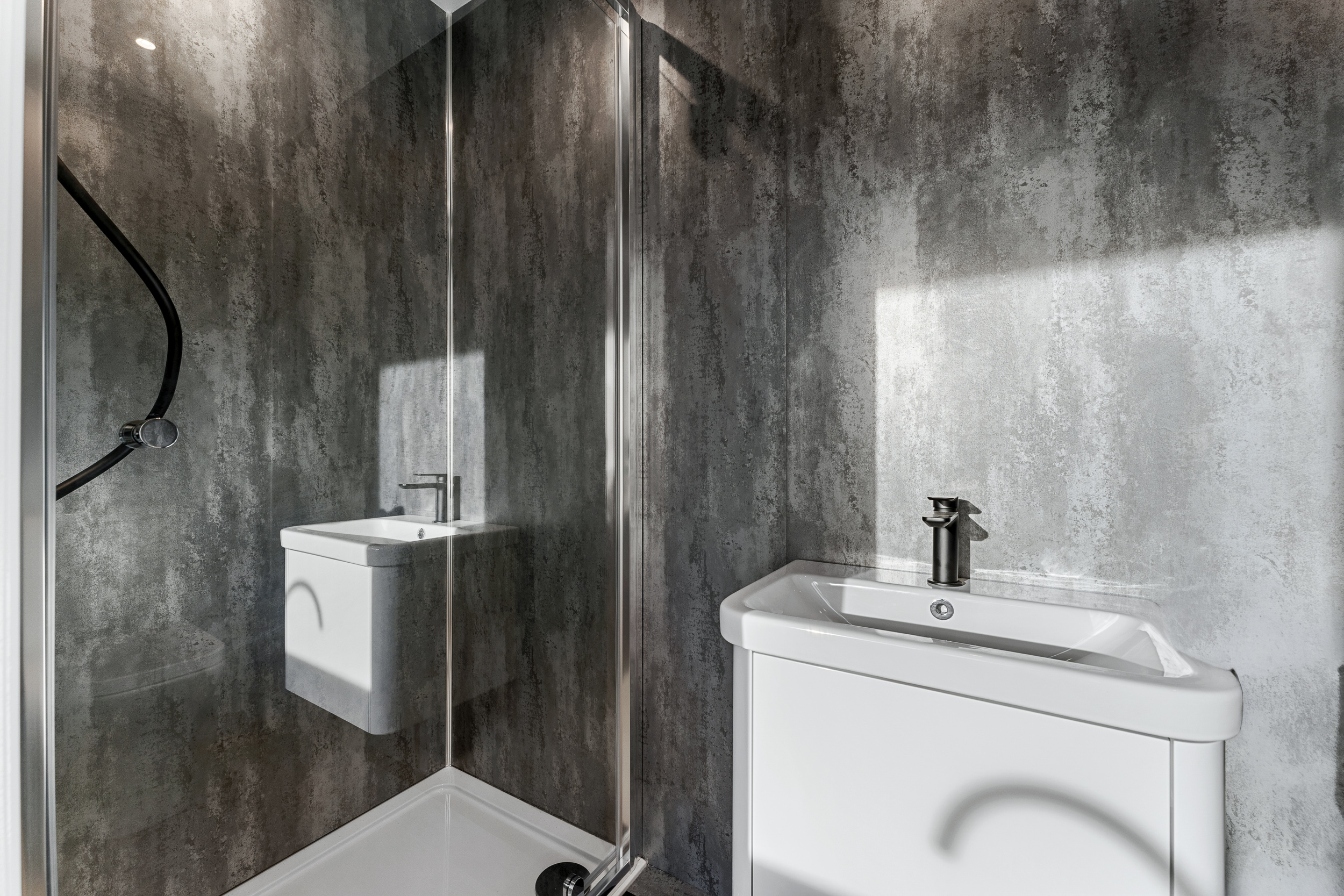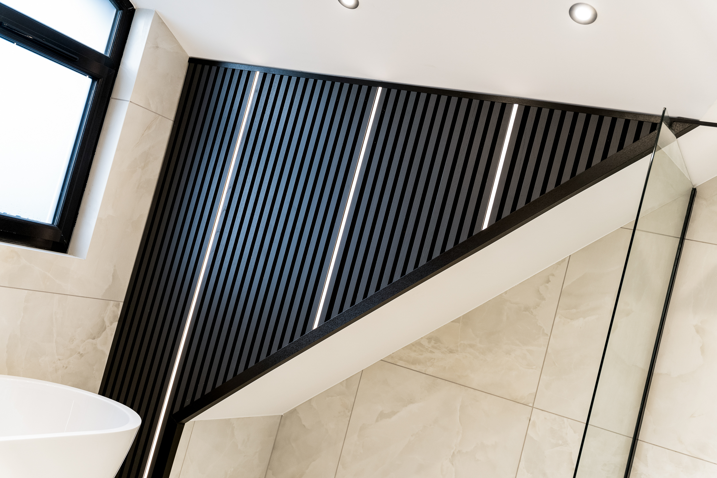 From the landing, the first floor leads to three further bedrooms and the family bathroom. The principal suite is a true highlight of the home, offering a calm, hotel-style retreat that has clearly been designed with both comfort and impact in mind. The bedroom itself is generously proportioned and flooded with natural light, while the en suite elevates the space to something special. Finished with large-format porcelain tiling, it features a striking freestanding bath positioned beneath contemporary dormer windows, creating a beautiful focal point. A walk-in rainfall shower with glass enclosure, twin wall-mounted basins set into a sleek floating vanity, and matt black fittings complete the look, while subtle feature lighting and vertical slatted detailing add texture and warmth. It’s a space that feels indulgent yet refined, perfect for unwinding at the end of the day.