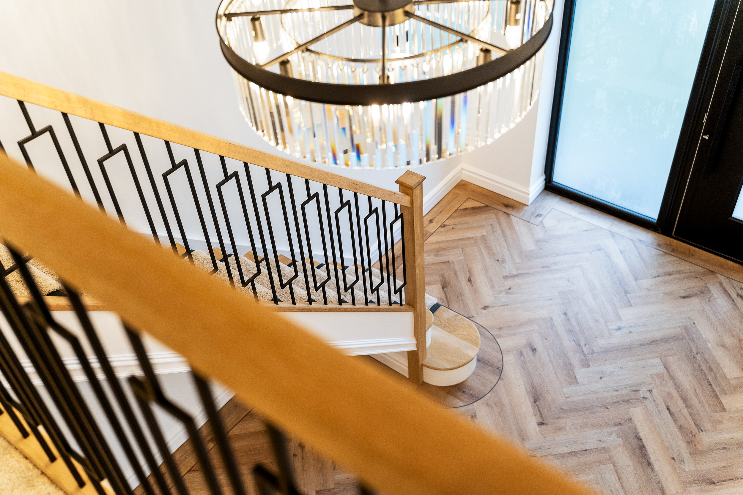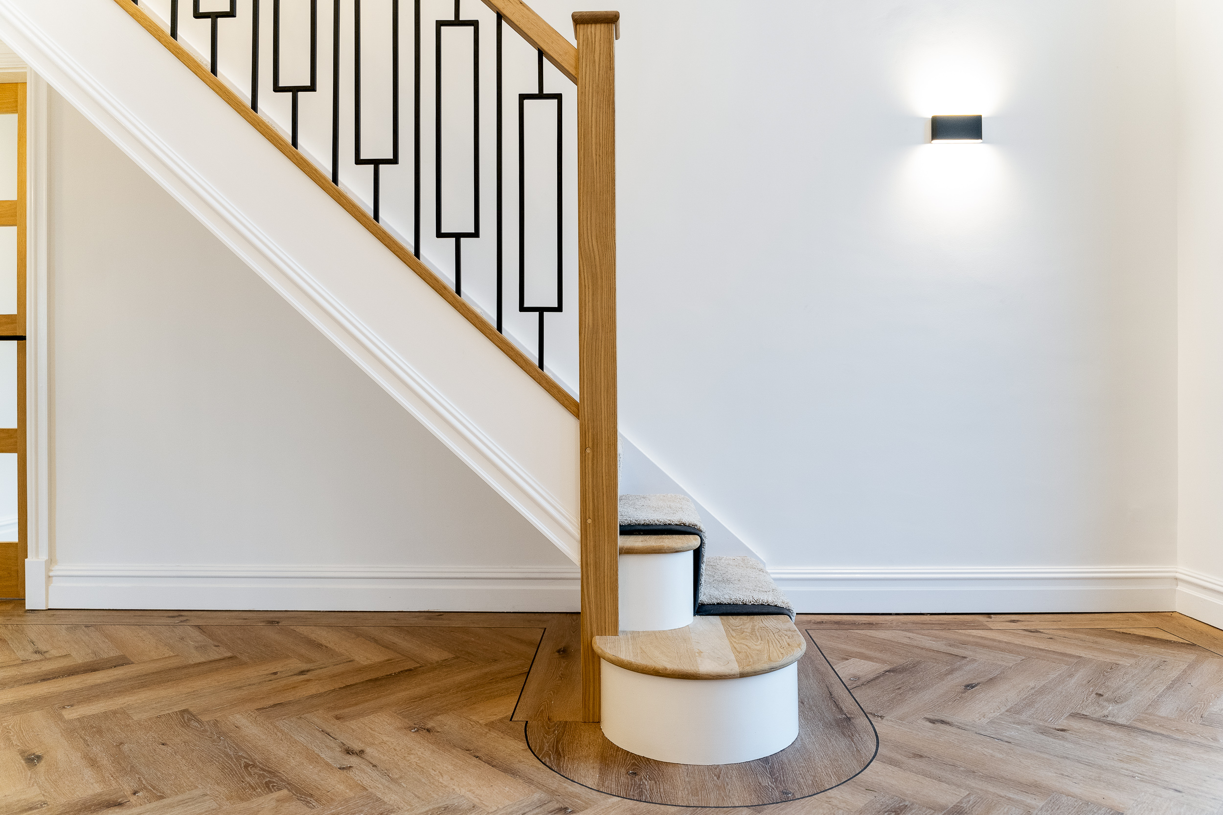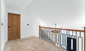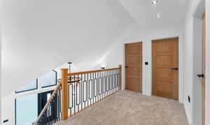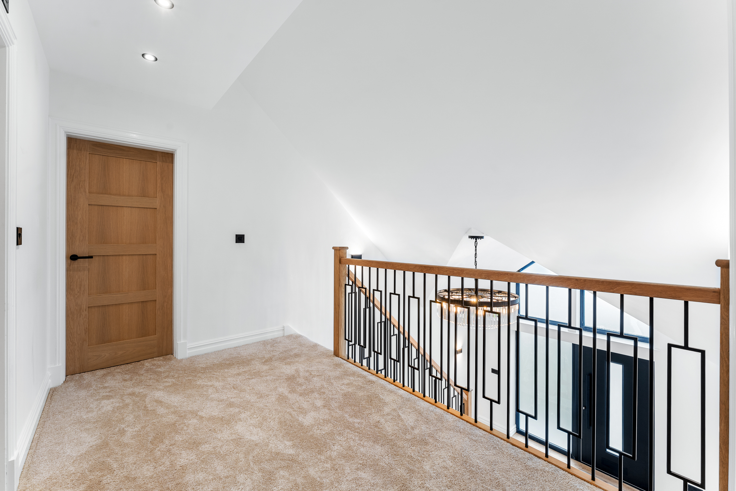 The staircase rises from the entrance hall through the centre of the home, combining solid oak handrails with sleek black balustrading and a soft carpet runner for comfort. At the top, a spacious, double-height landing creates a real sense of arrival on the first floor, flooded with light and centred around a striking statement chandelier. This elegant transitional space adds architectural drama while providing a calm, cohesive connection between the bedrooms and bathrooms on this level.