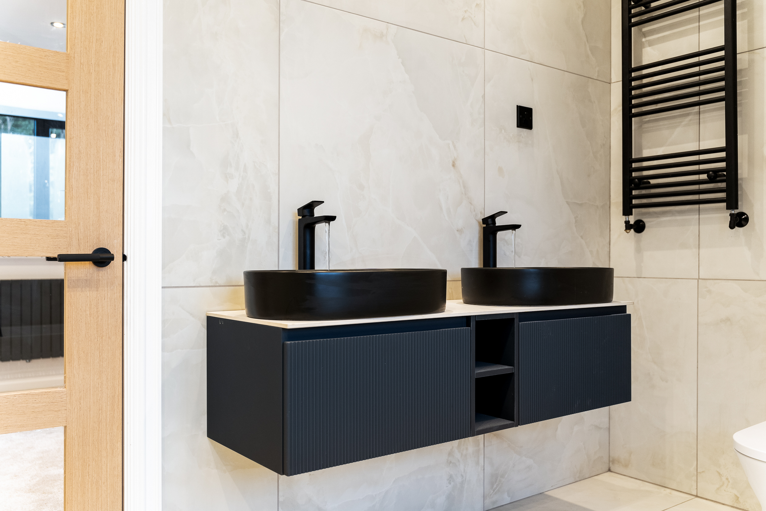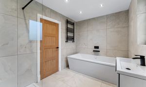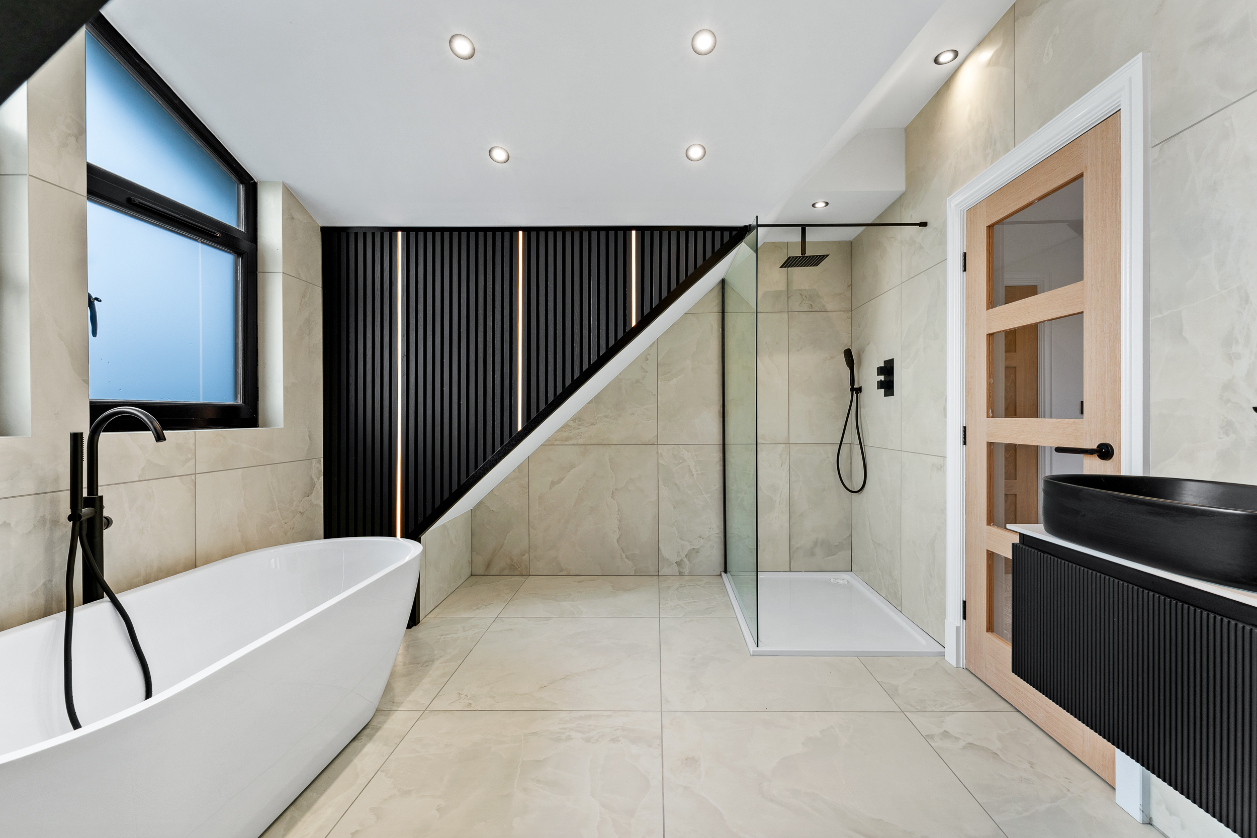 Serving the remaining bedrooms is a beautifully finished family bathroom that continues the home’s high design standard. Fully tiled in large-format porcelain, the space has been thoughtfully laid out to balance everyday practicality with a refined, spa-like feel. A contemporary bath with wall-mounted taps sits alongside a separate walk-in rainfall shower with glass enclosure, while a sleek floating vanity with integrated basin and matt black fittings provides a crisp, modern contrast. Recessed lighting and a heated towel radiator complete a bathroom that feels both elegant and effortlessly functional for family use.