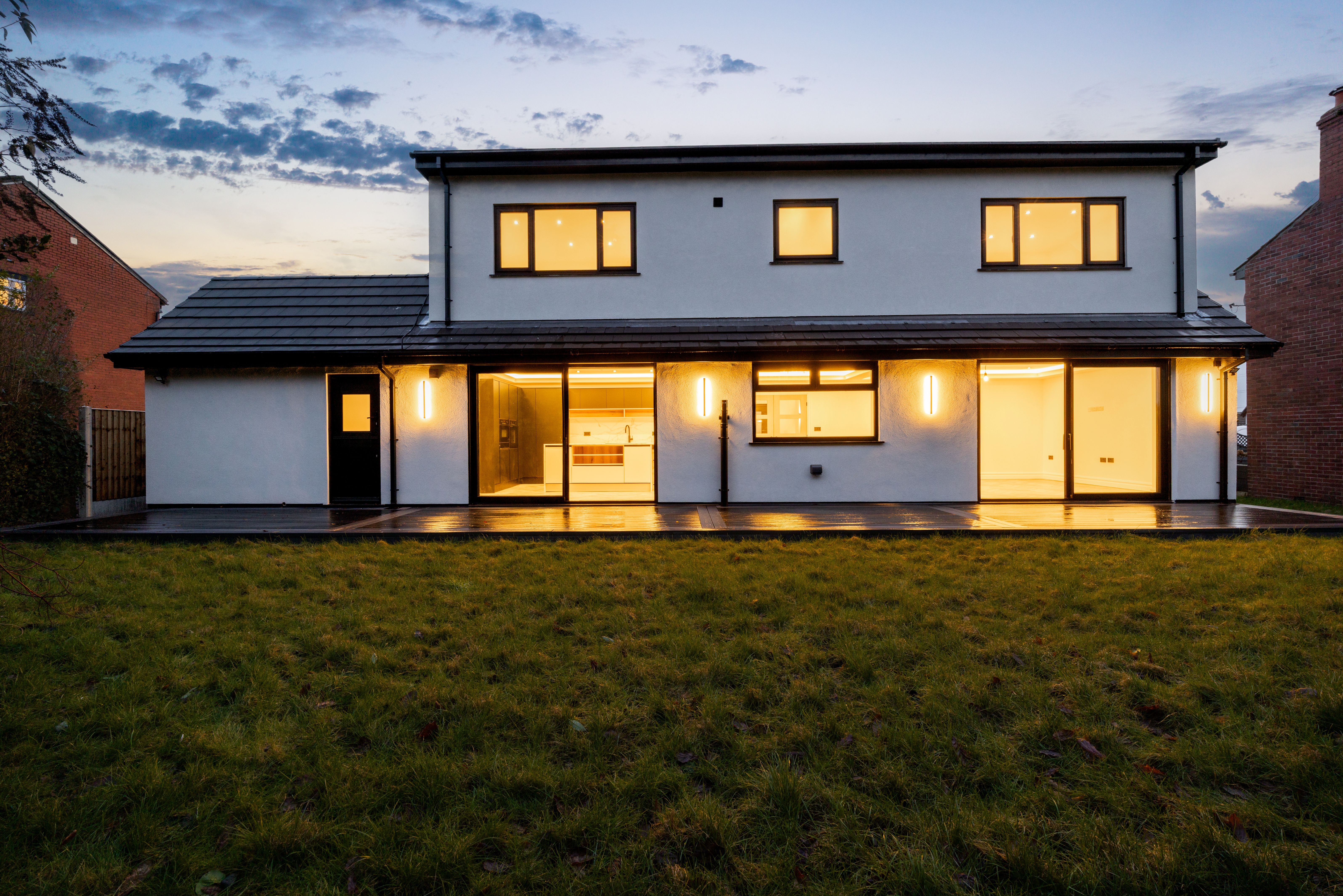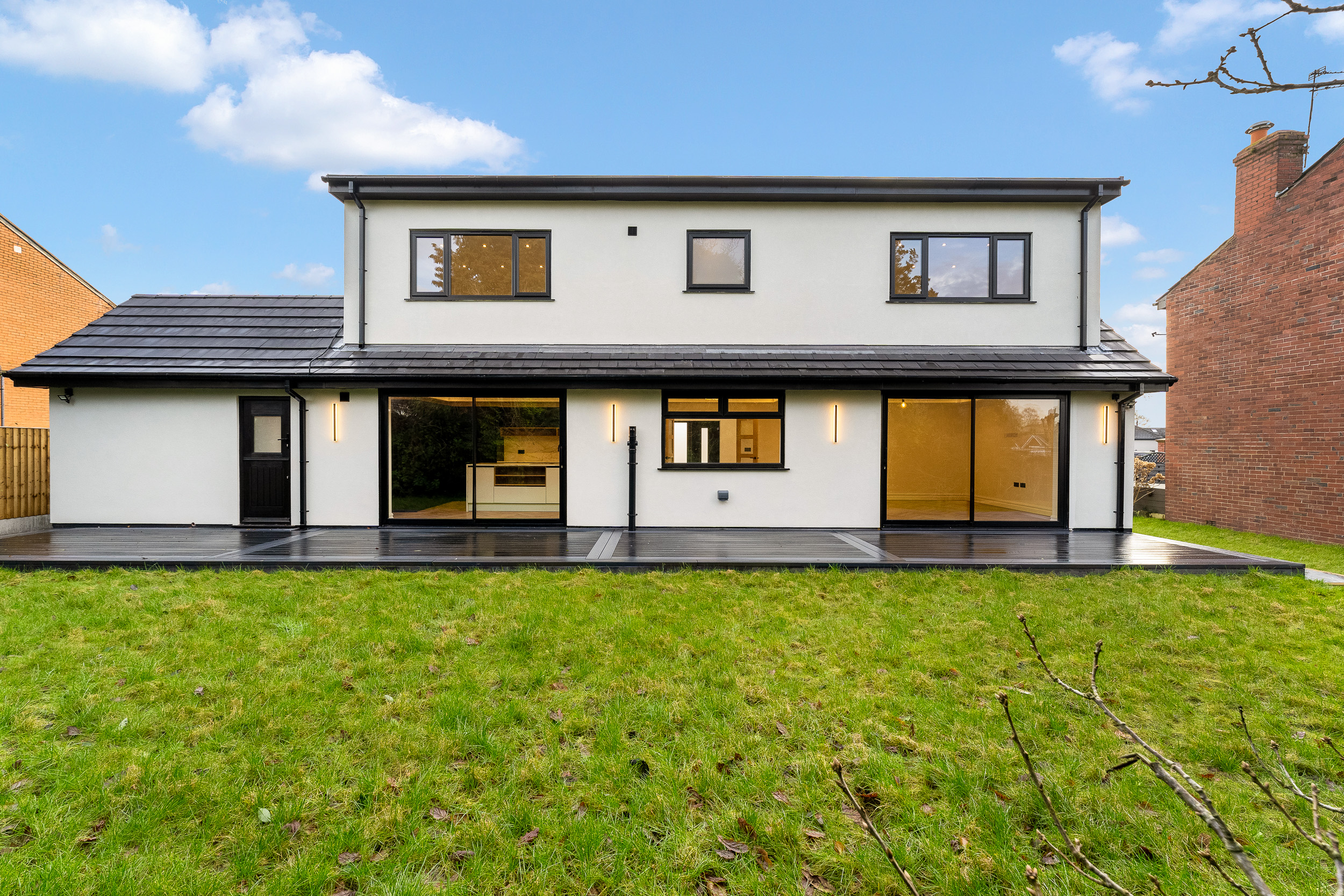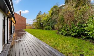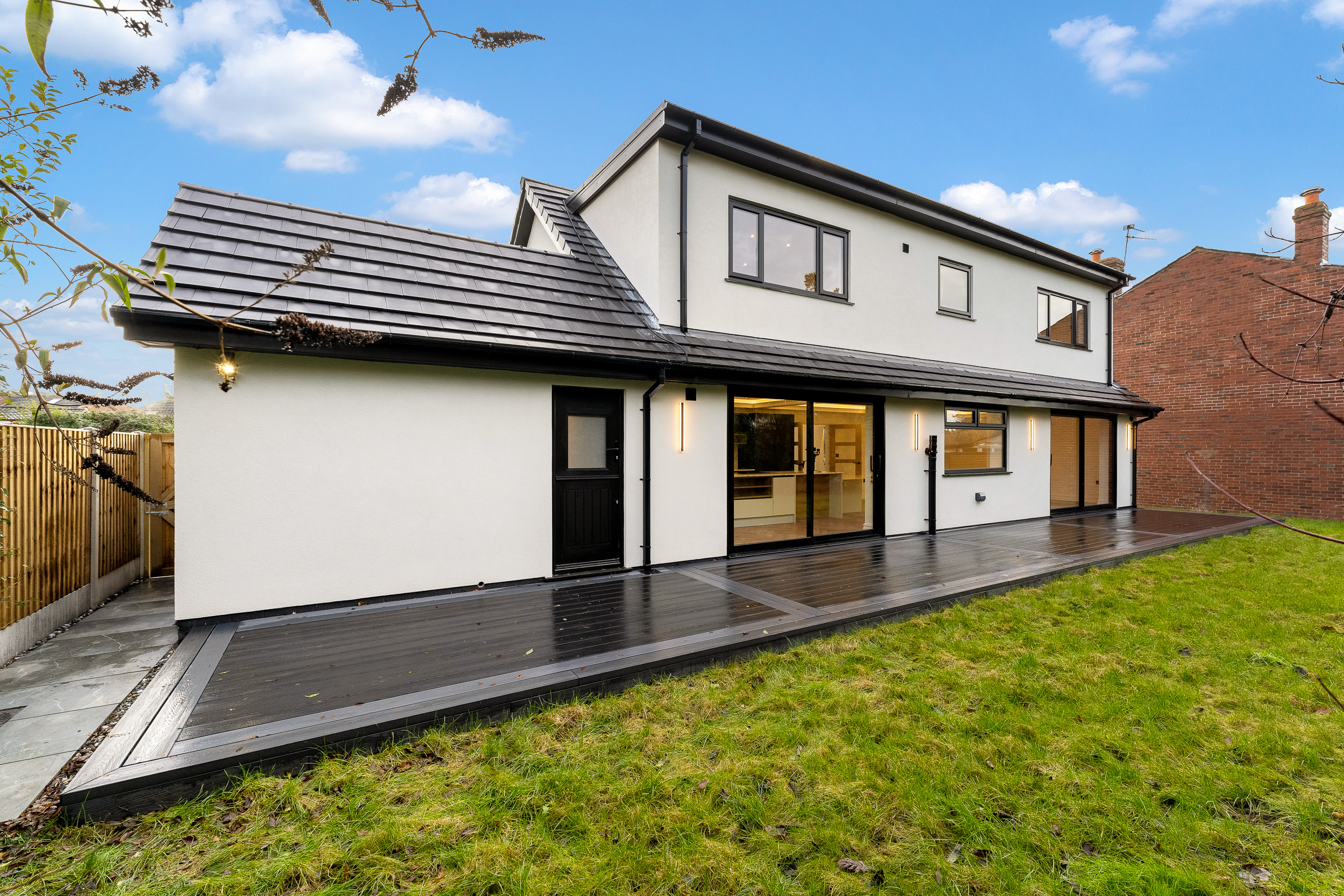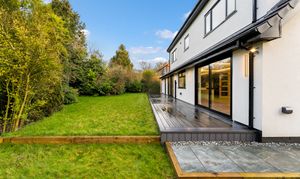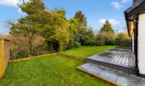 To the rear, the garden has been designed with low maintenance and entertaining in mind. Newly laid porcelain paving and composite decking create stylish seating areas for summer dining, while the secure, private setting makes it ideal for families and social gatherings alike. The combination of practical finishes and thoughtful lighting ensures the space can be enjoyed from day through to evening.