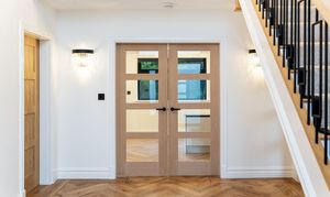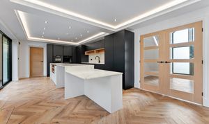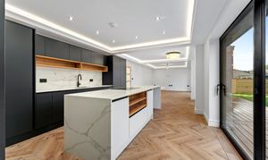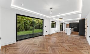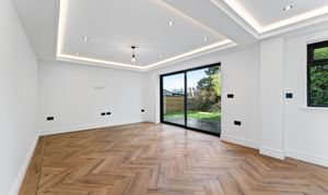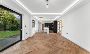 Step inside and you are welcomed into an impressive entrance hall that immediately conveys a sense of space and design. Finished with elegant herringbone flooring and contemporary wall lighting, the hallway feels both refined and inviting, with natural light filtering through the glazed front door. From here, the layout flows effortlessly into the principal ground-floor rooms, while underfloor heating throughout the ground floor ensures year-round comfort with individual zone control to every room.