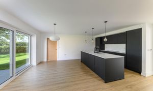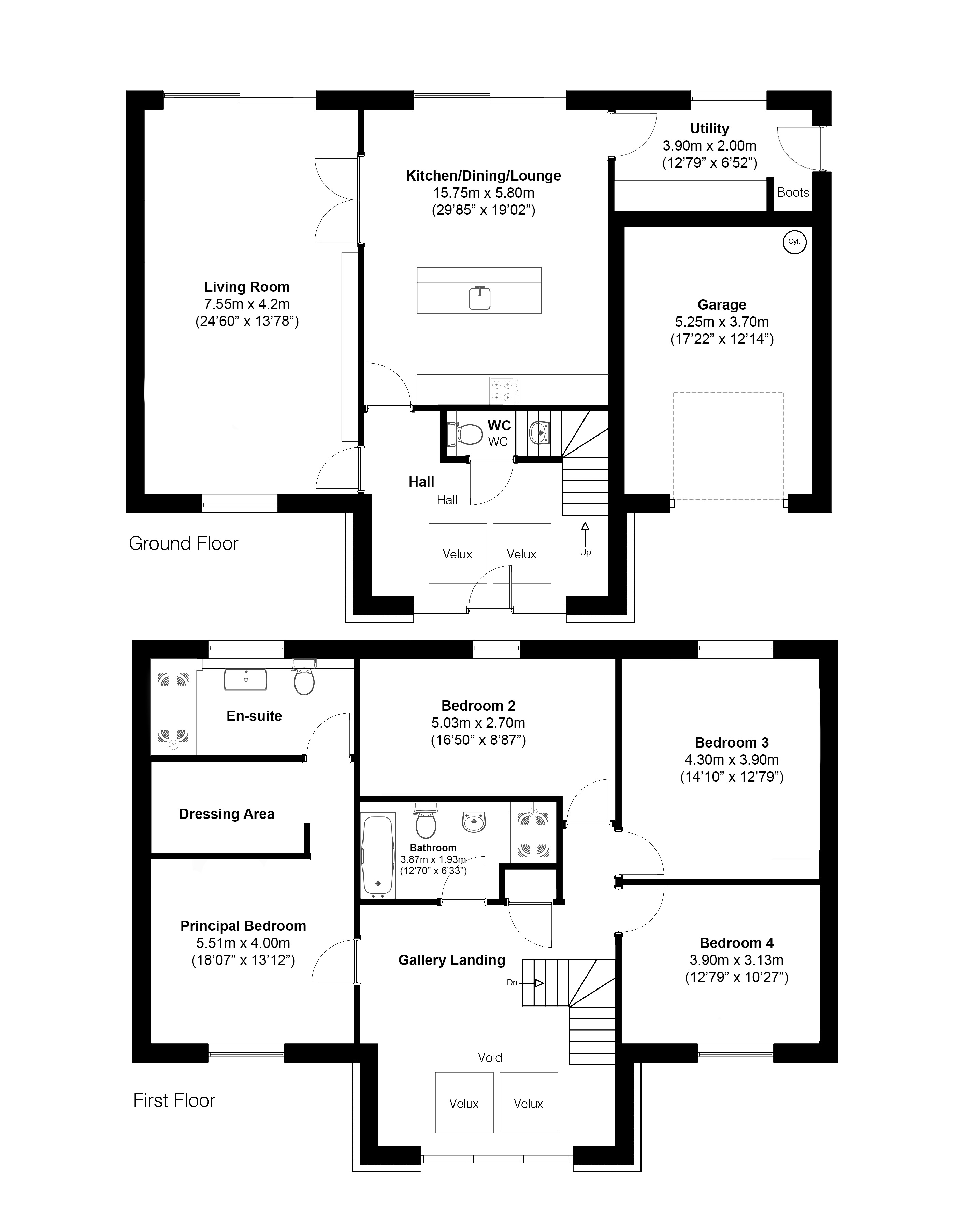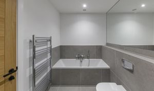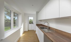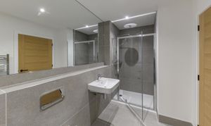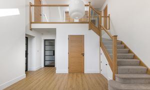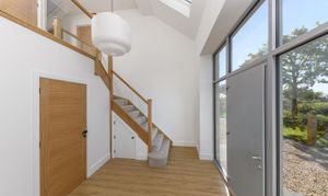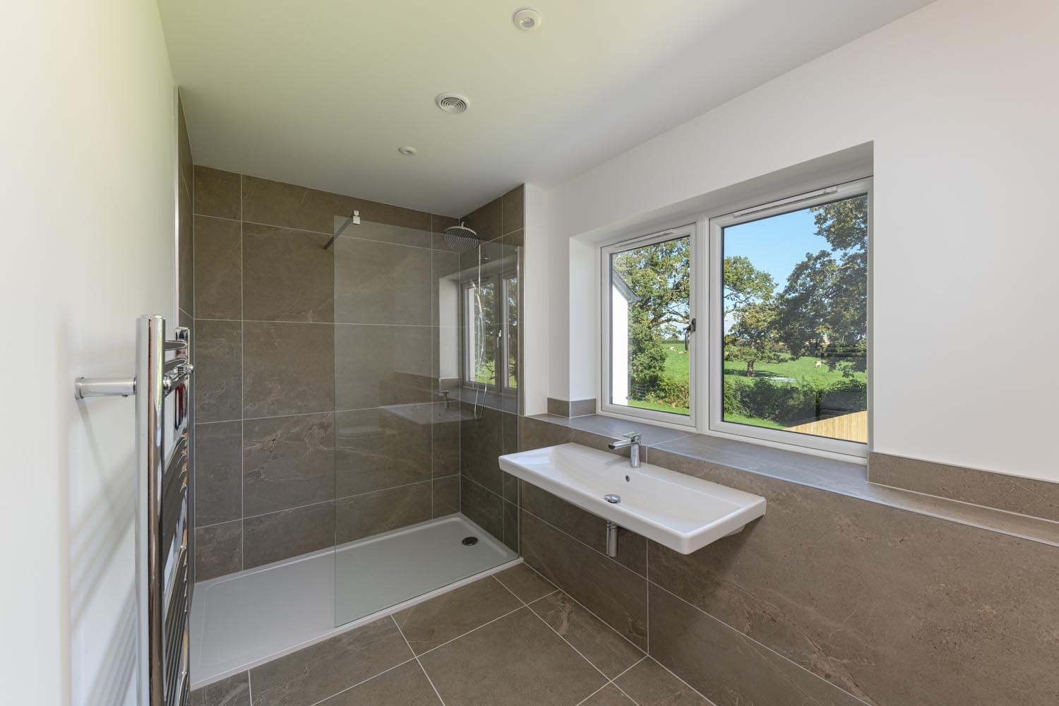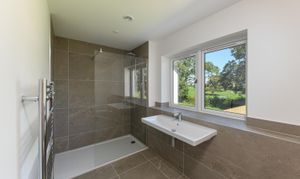 Upstairs, the galleried landing overlooks the feature window capturing the fell outlook. The principal bedroom also enjoys uninterrupted fell views and includes a dressing area and well finished en suite with a large walk in rainfall shower. Three further bedrooms benefit from open rural views and are served by a family bathroom with a bathtub and a separate walk in shower. Bathrooms are individually designed with Villeroy and Boch fittings and large format porcelain tiling, keeping the finish coherent and elegant throughout.