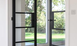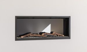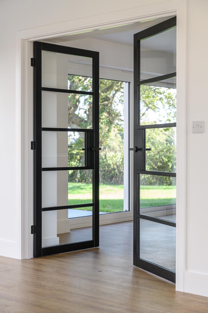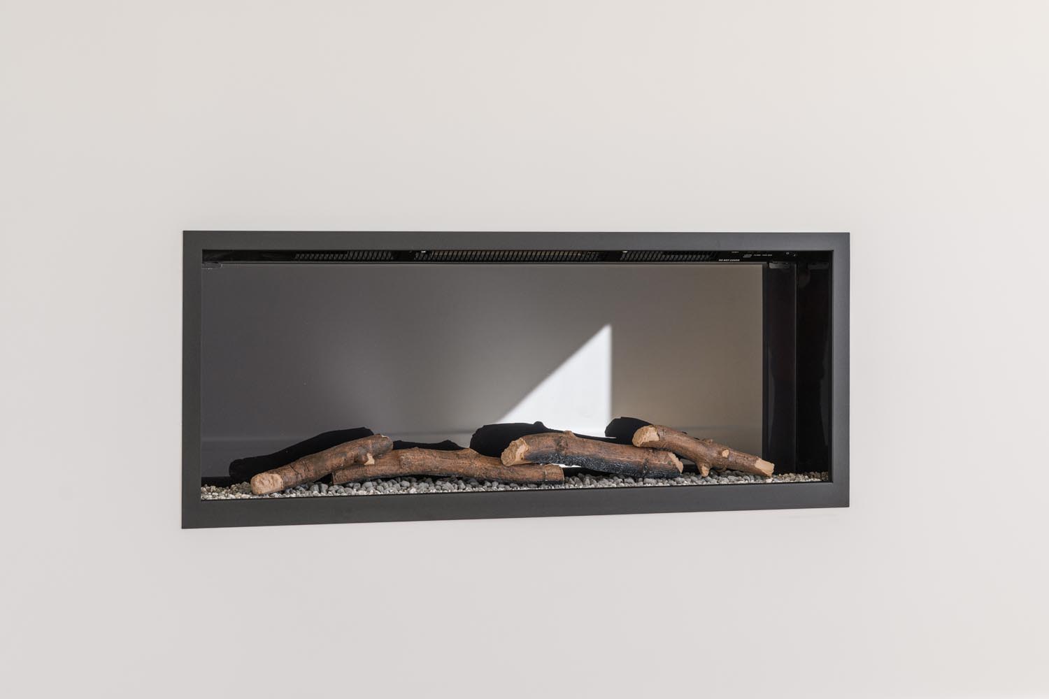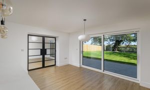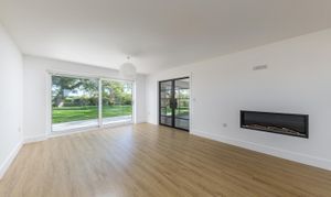 Glazed crittall style double doors connect to a generous living room, a quieter setting for evenings with a contemporary inset fire, enjoying fell views and direct access through a second set of sliding doors to the terrace and lawn.