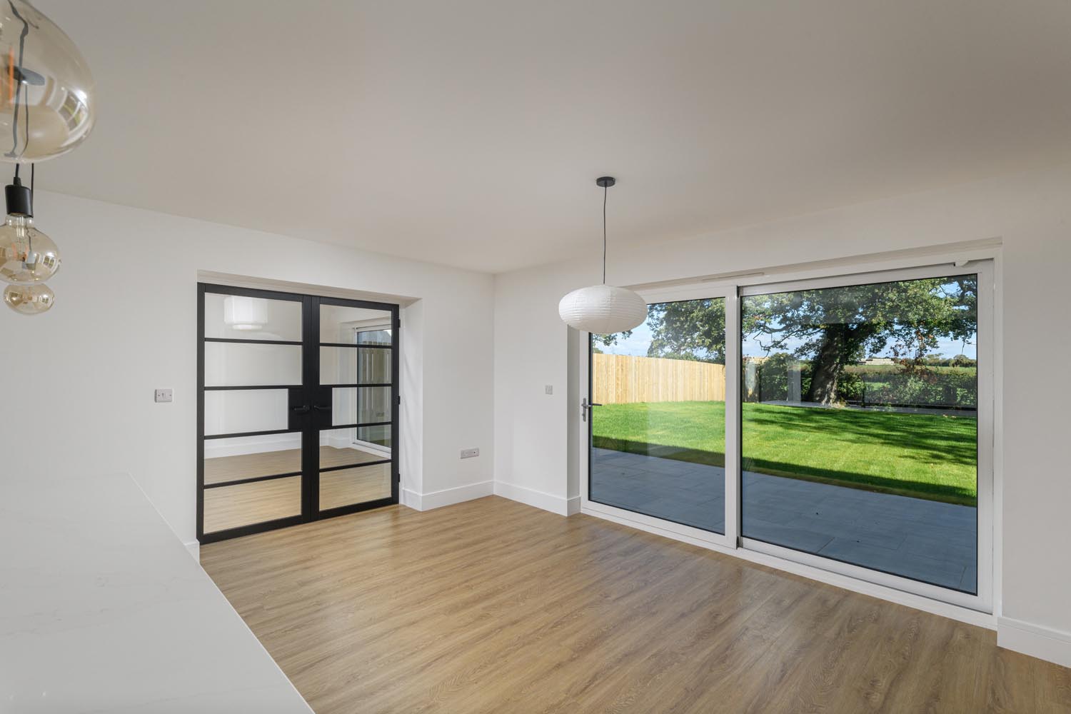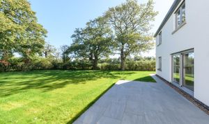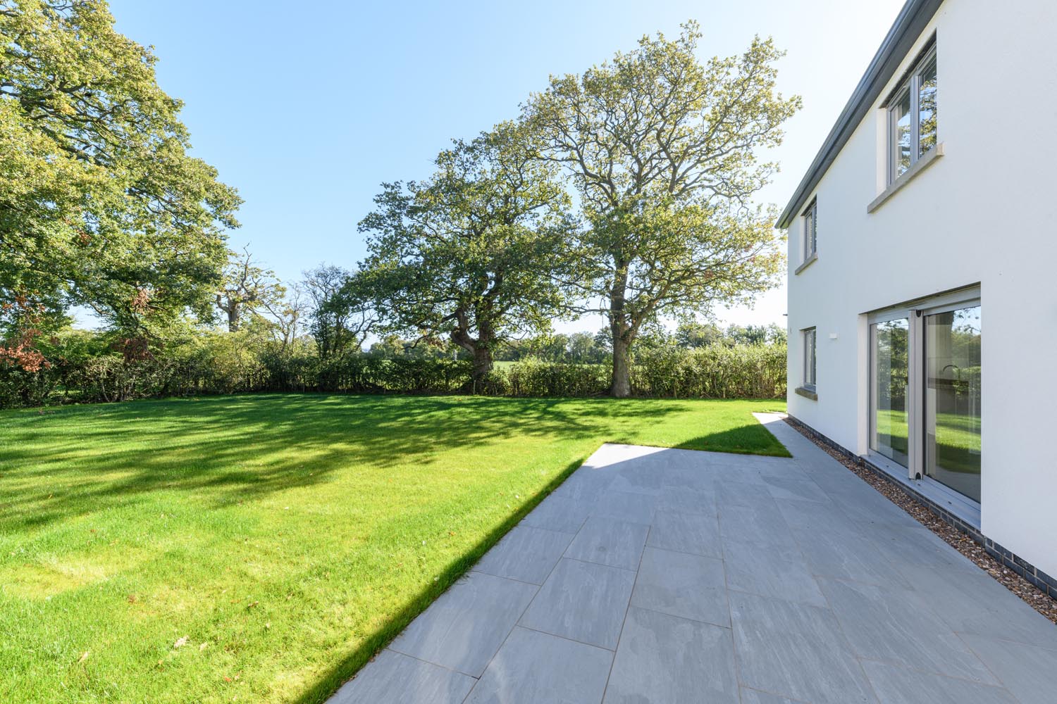 Wide sliding doors link the main living spaces to a broad porcelain tiled terrace, ideal for outdoor dining and relaxed gatherings. The level, newly laid lawn is generous, edged by established hedging and mature trees that reinforce privacy and frame the rural views. To the front, a large gravelled drive provides ample parking and leads to the garage with electric sectional door. The setting at the entrance to the village secures the open aspect on three sides and underscores the sense of space.