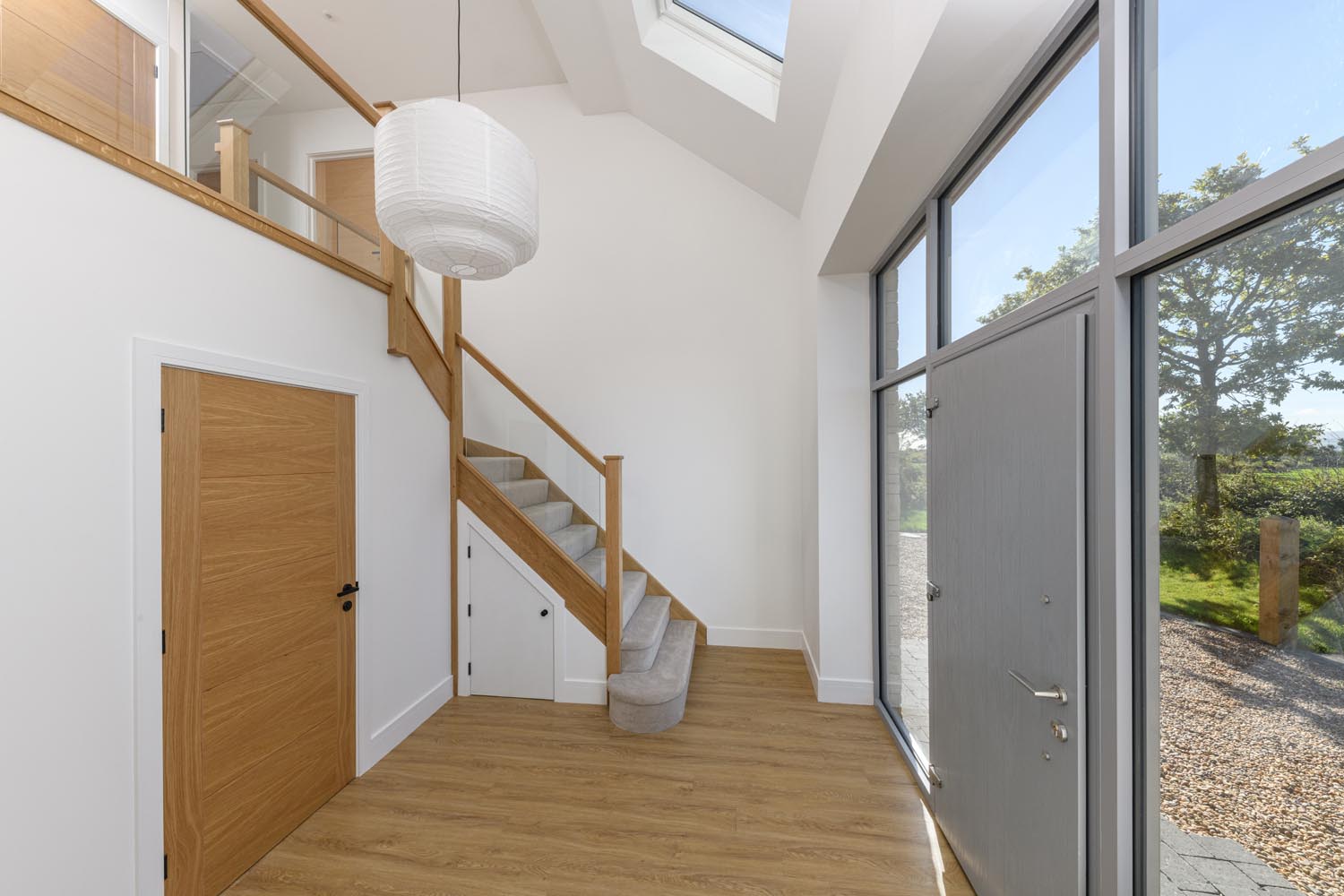 Arrival is into a dramatic double height hall, full height glazing and twin roof lights drawing daylight through the centre of the plan. Oak and glass balustrades frame the galleried landing above and there is useful understairs storage. The flow leads into a bright kitchen, dining and living space arranged for both everyday use and entertaining. The sleek German kitchen presents matt cabinetry, a long quartz topped island with integrated sink and is well-appointed with AEG appliances. Wide aluminum sliding doors open directly to the terrace naturally expanding the space for summer dining and offering enjoyment of the garden and open views beyond.