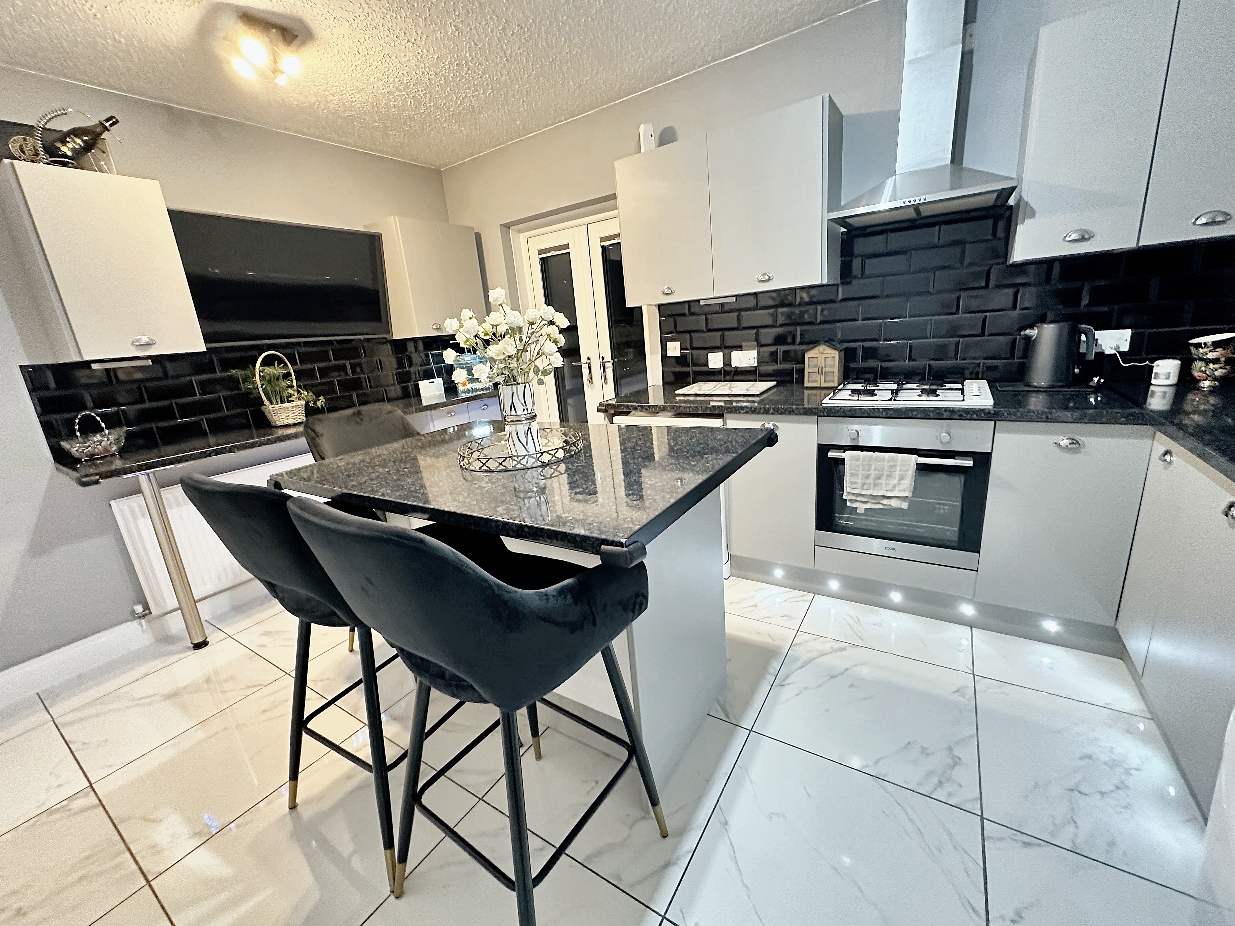Breakfast island with built-in cupboards, marble tiled flooring, laminated worktop space, double glazed window, integrated Bosch gas hob, sink unit, French double glazed UPVC doors, wall and base units, lower level floor spot lighting under the units, space for a washing machine and dishwasher, stainless steel extractor fan, integrated electric oven, radiator. Access to a cupboard and a bar area which is positioned under the stairs.