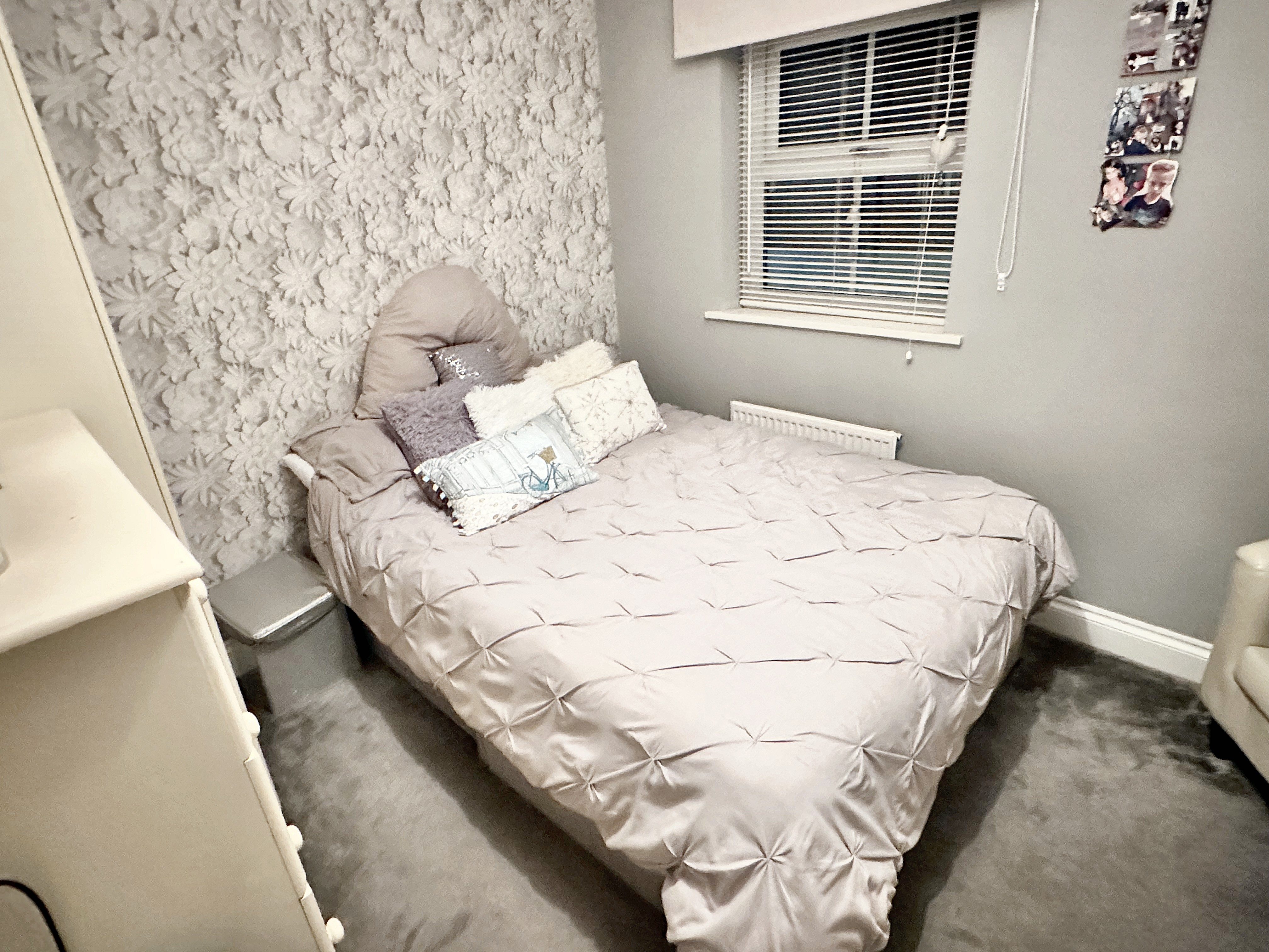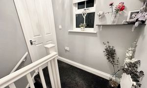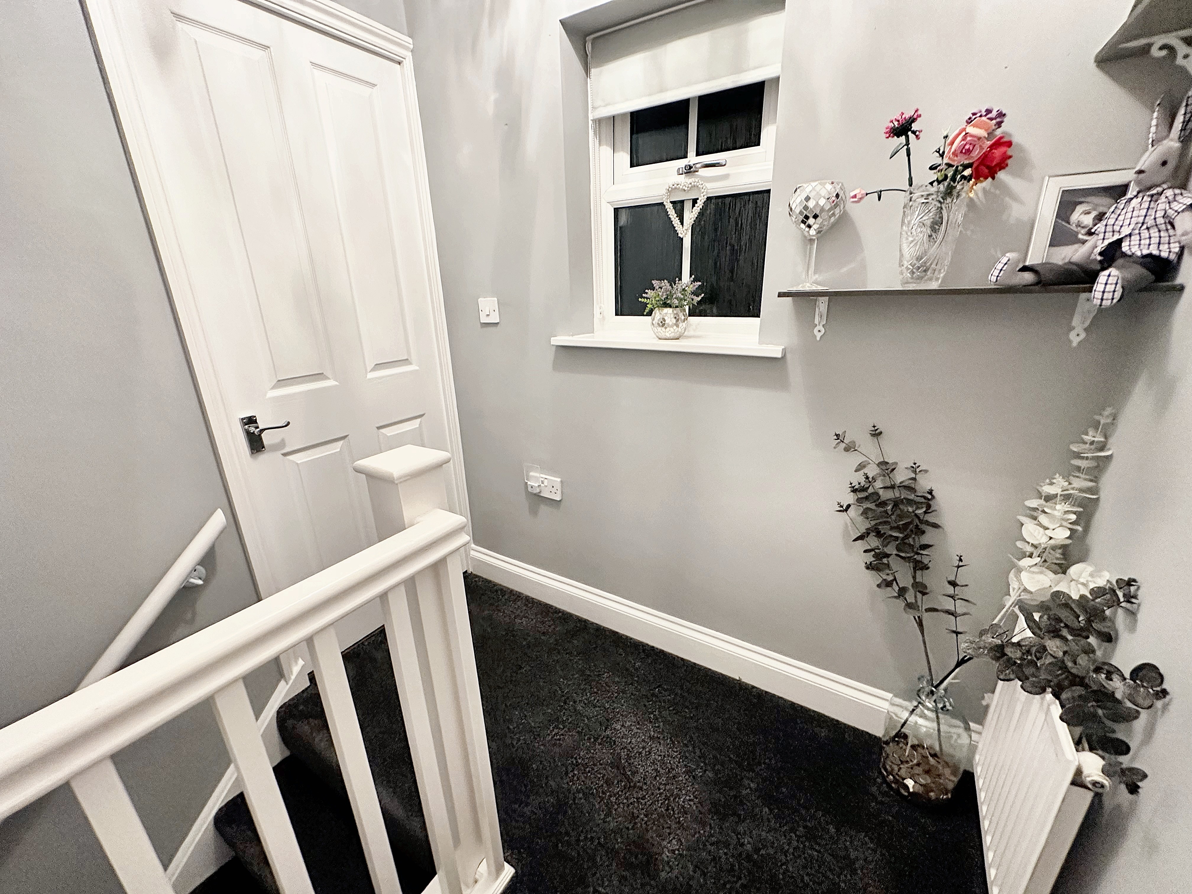 Double glazed window, cupboard over the stairs, carpeted and radiator.