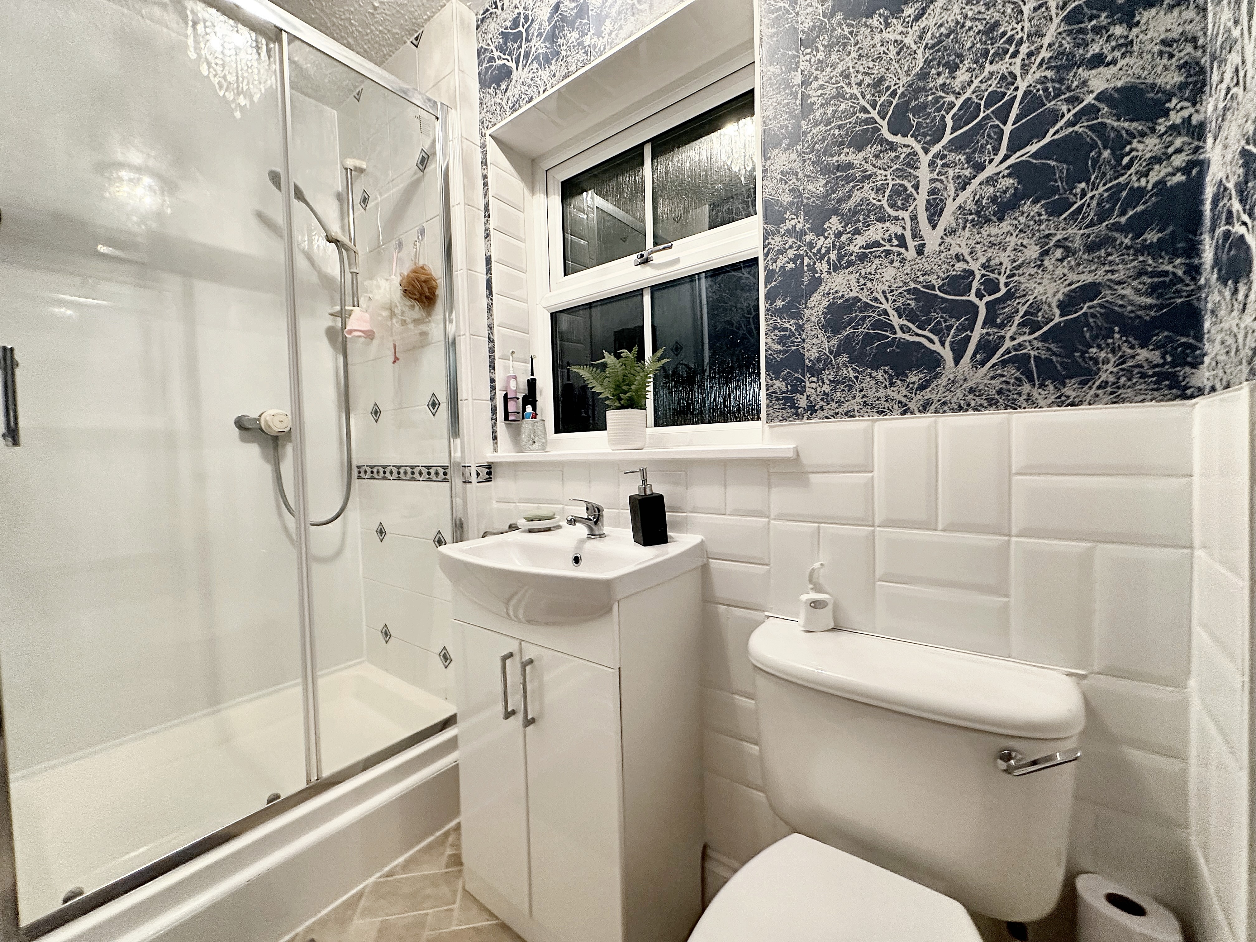 Tiled walls and floor, bath tub, WC, wash basin with storage, extractor fan, double glazed obscured glassed window.