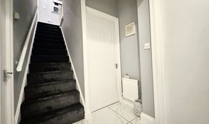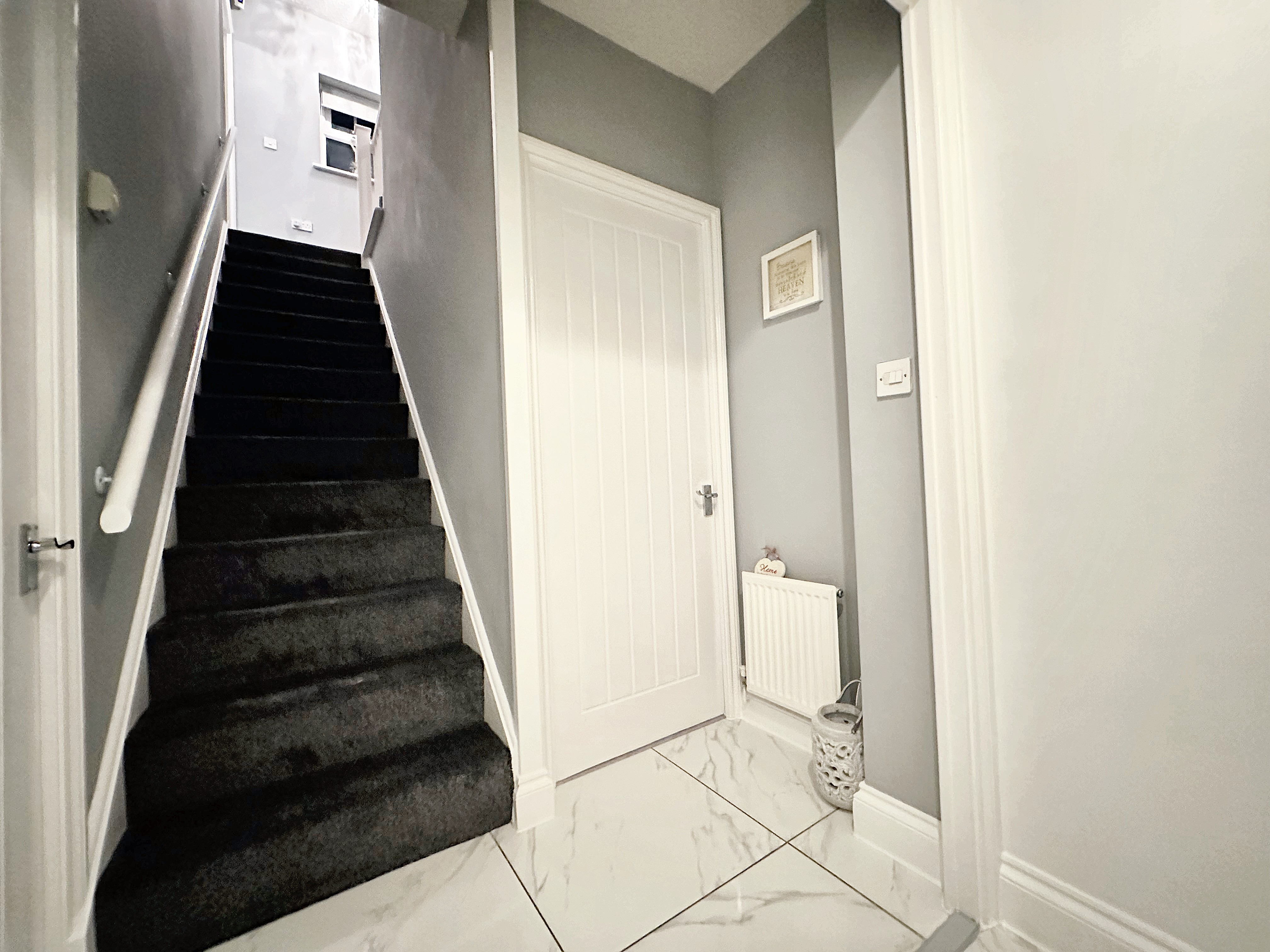 Access to a storage cupboard, composite front door, marble tiled flooring, radiator.
