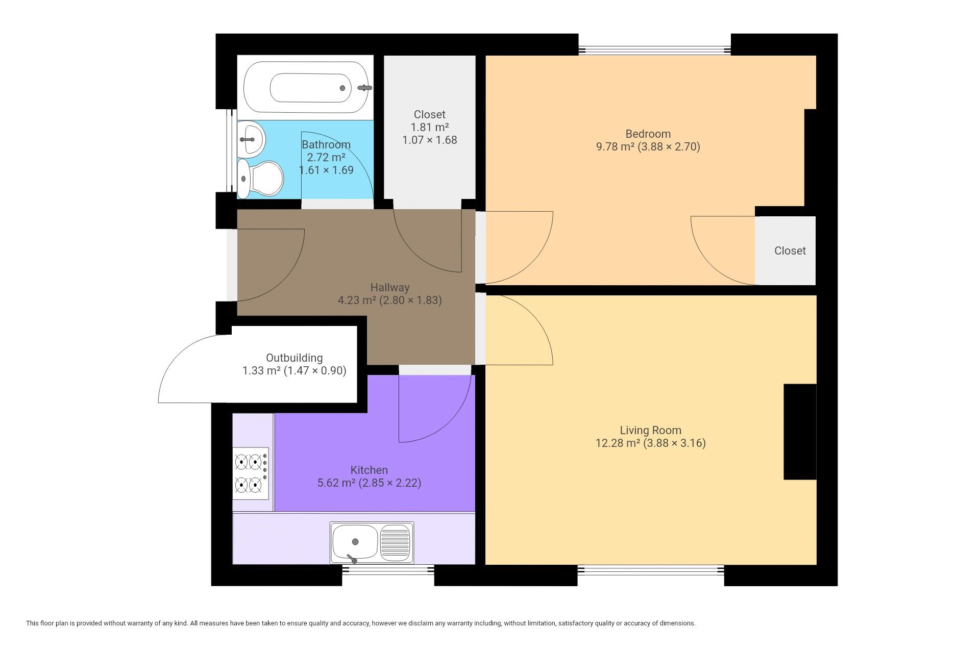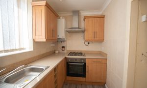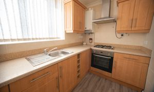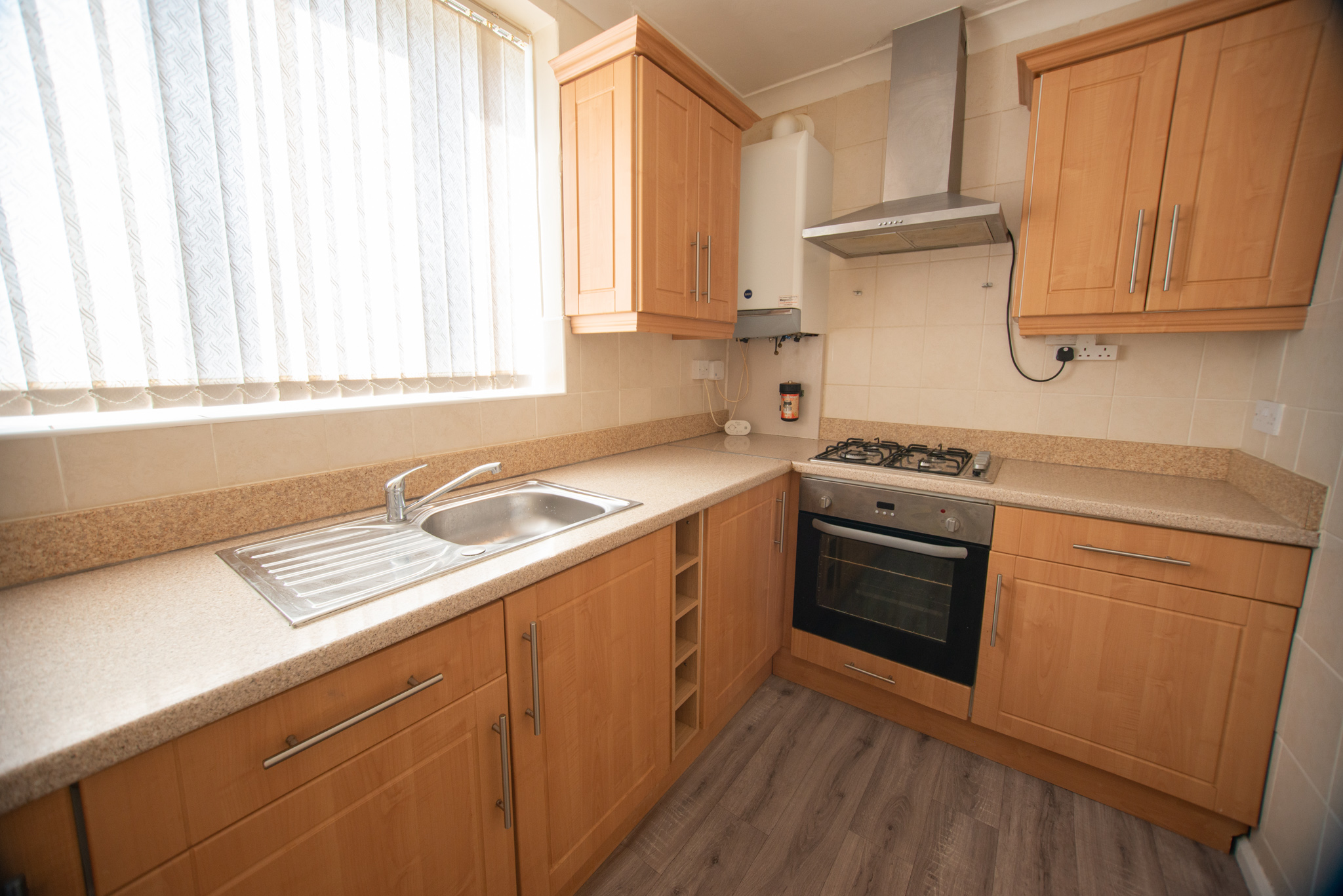 With vinyl flooring, central heating boiler, laminate work surfaces, hob, oven, extractor fan, sink/drainer, radiator and double glazed window.