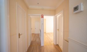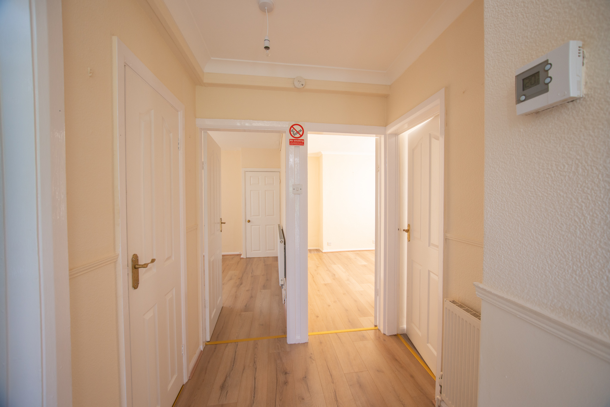 With laminate flooring, radiator and doors leading to the bathroom, bedroom, living room and kitchen.