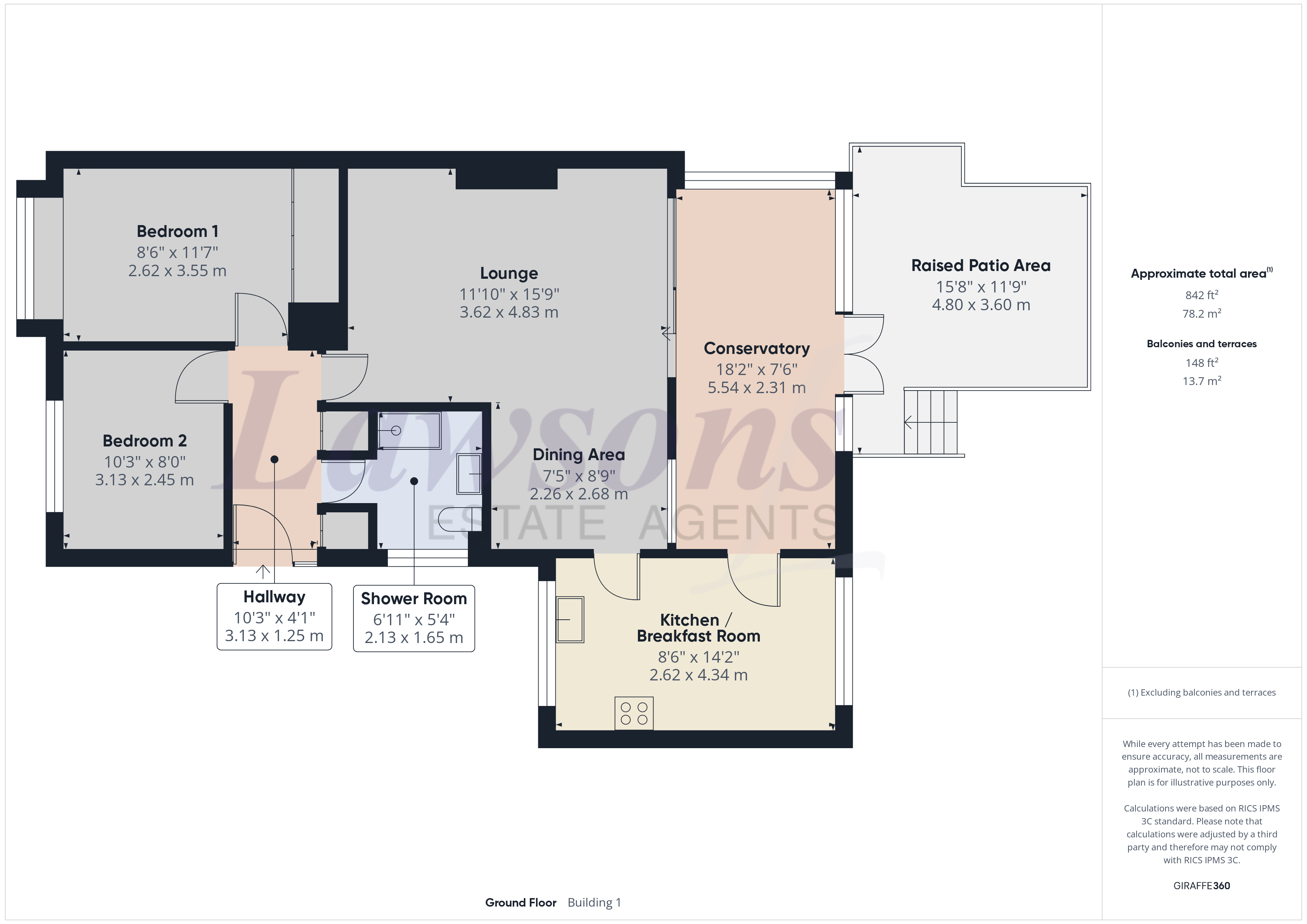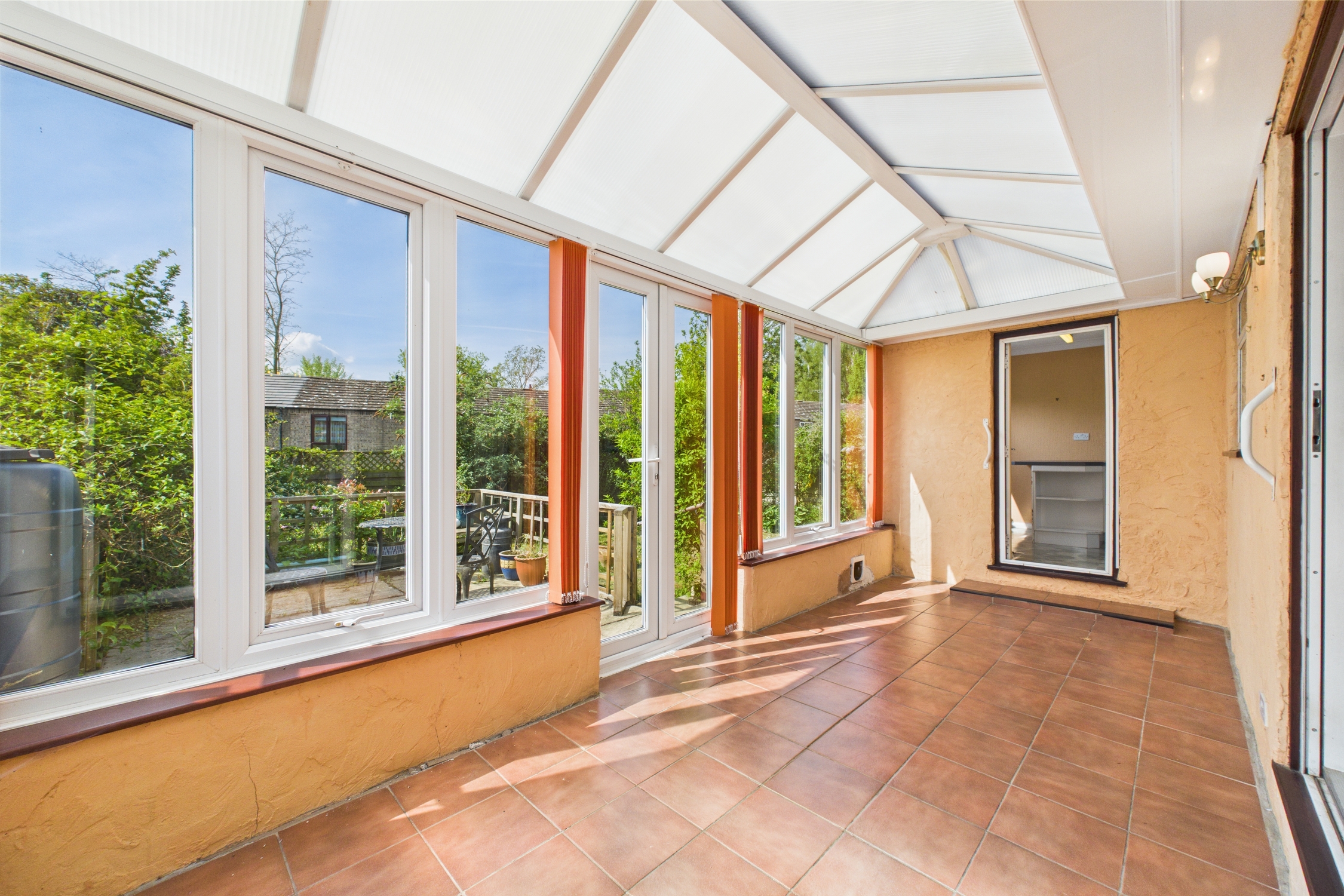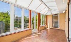Frosted windows to side, further windows to rear, with low level wall to side and rear, tiled flooring, patio door to lounge, single door to kitchen / breakfast room, and French doors to rear garden.