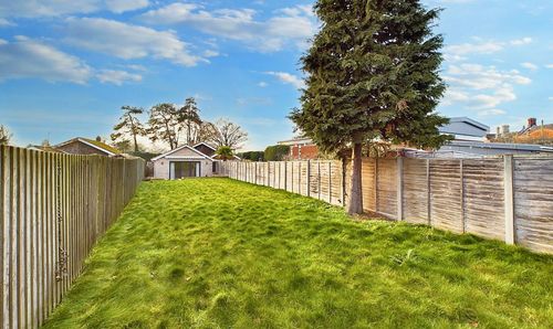 Mainly laid to lawn, with mature shrubs, raised patio area to the immediate rear of the conservatory, and pathway leading to the side access gates to front.