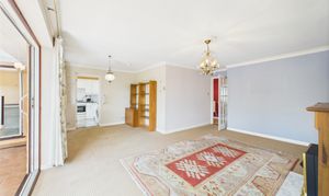 Window to conservatory, with radiator, carpet flooring, and door to kitchen / breakfast room.