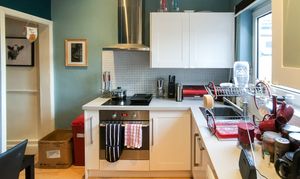 A well proportioned, modern kitchen with a range of white, fitted units. leads through to the bathroom
