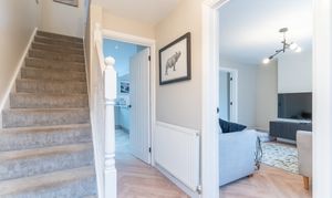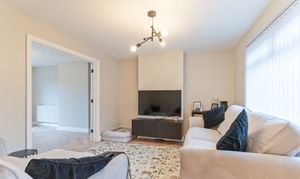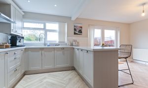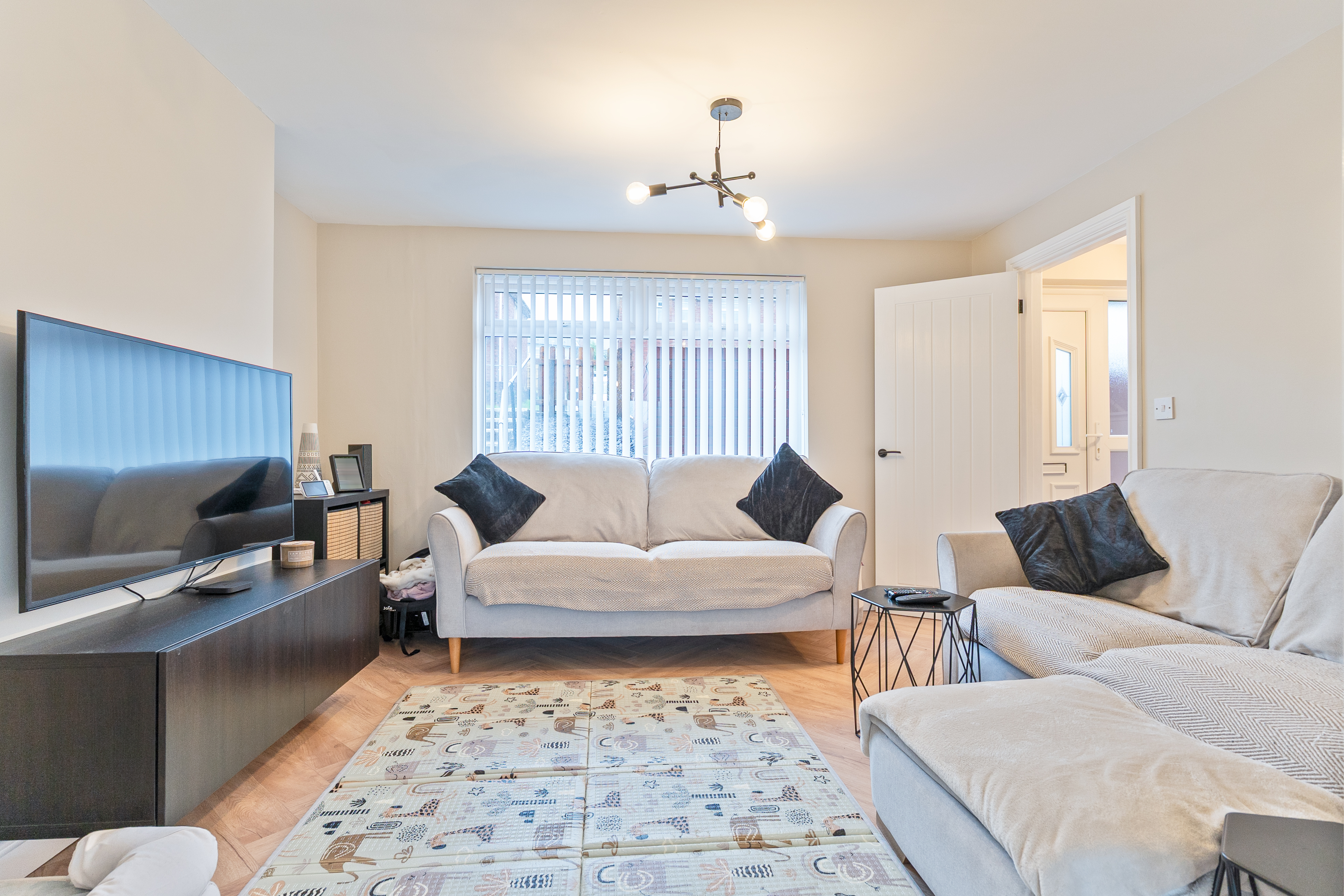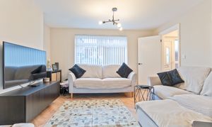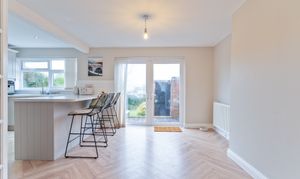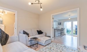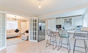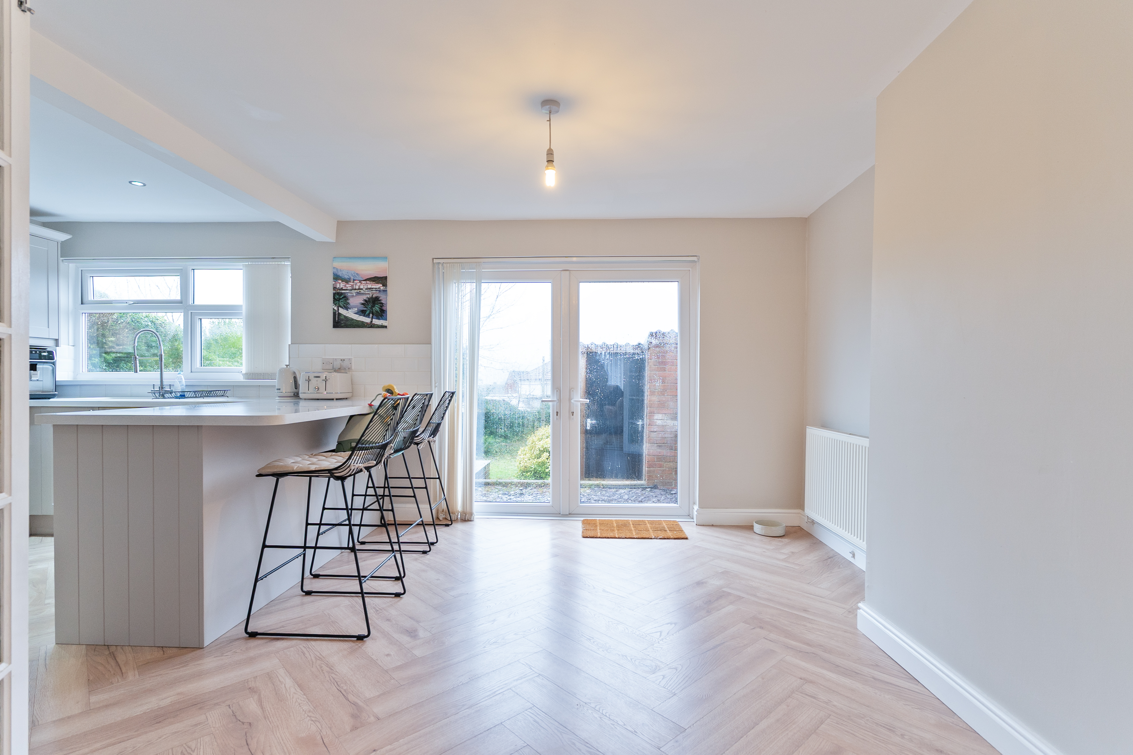 You enter the property through a welcoming hallway, which provides access to the main living areas and the staircase leading to the first floor. To the right is the bright and modern living room, a stylish and comfortable space enhanced by natural light. Double doors lead through to the contemporary kitchen/diner positioned at the rear of the home. This open-plan area features a modern fitted kitchen complete with a breakfast bar, offering both a practical workspace and a relaxed seating option. There is also ample room for a dining table, making it an excellent social and family space.