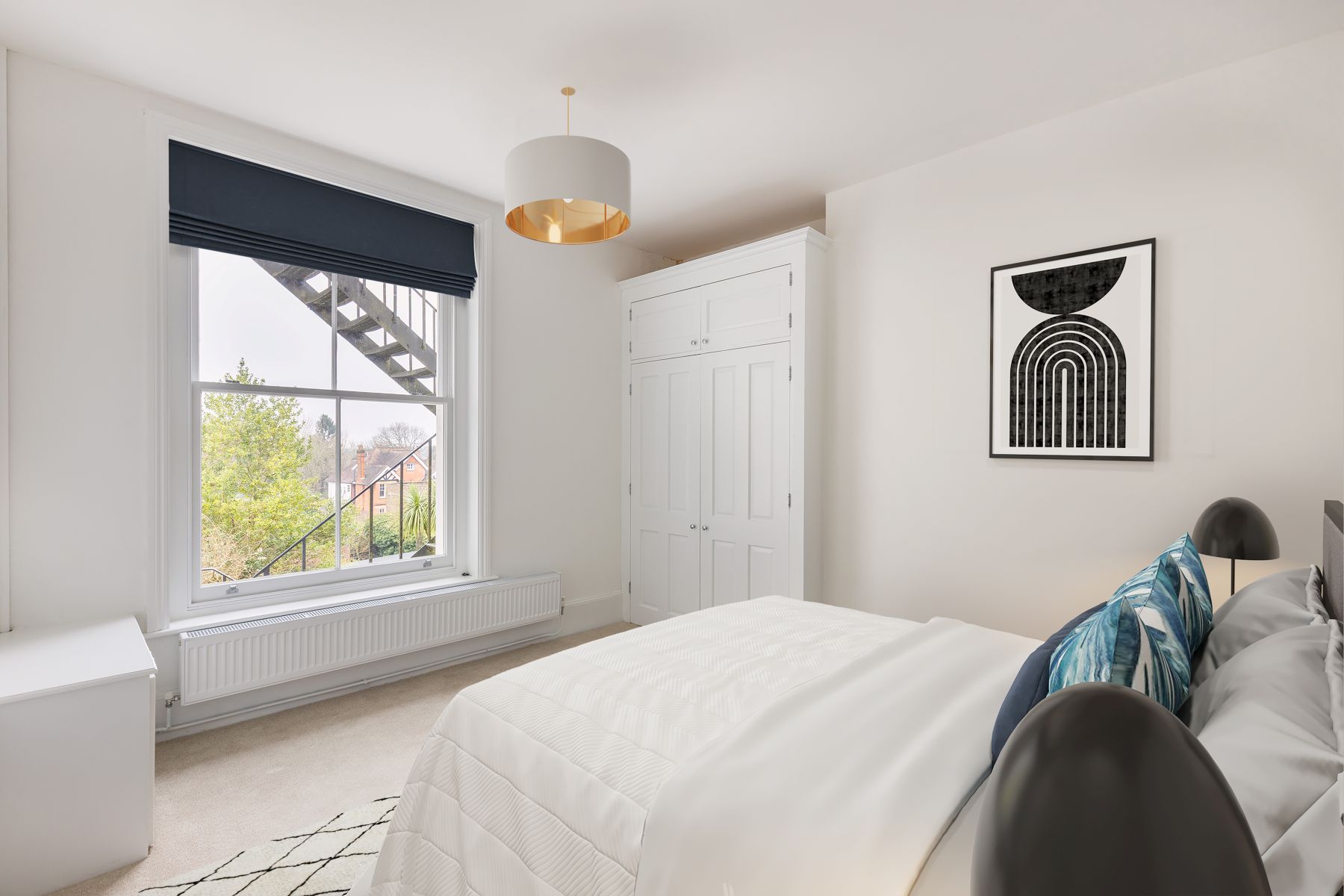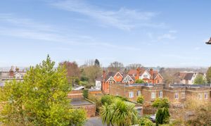 This apartment is set at the rear of a period building, on the second floor and accessed from a communal entrance to the side as well as having its own entrance via an external staircase to the rear. The welcoming entrance hall has two useful built-in storage cupboards and tall ceilings. The sitting room is a lovely double aspect room with period features including high ceilings, recently re-strung sash windows, picture rail and an ornate plaster ceiling rose. This room faces south-west, with far reaching views over rooftops and treetops and a perfect vantage point for enjoying sunsets.